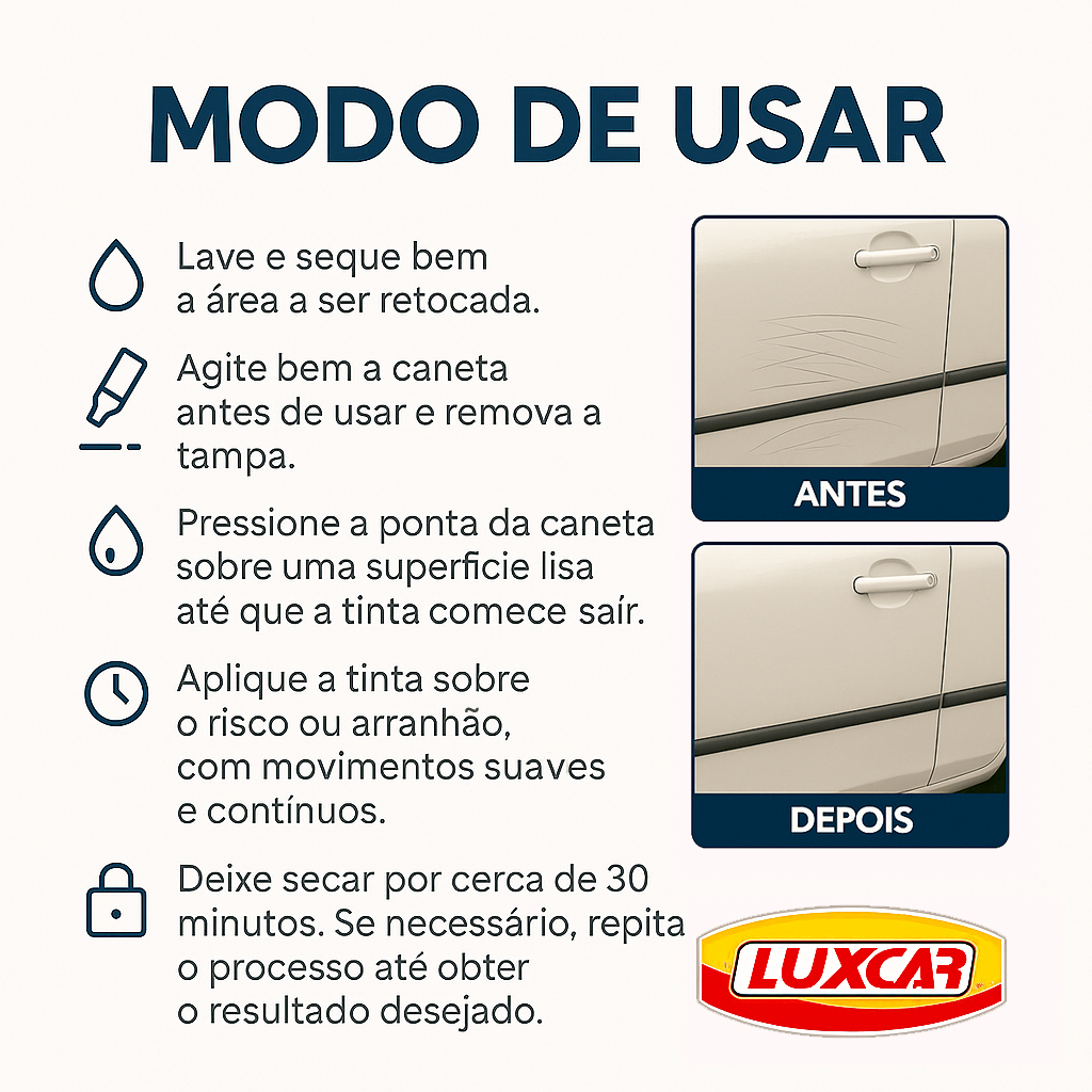 A Caneta Retok Luxcar é a solução ideal para disfarçar e reparar riscos, arranhões e pequenas imperfeições na pintura do seu carro, moto ou bicicleta. Desenvolvida com tinta automotiva de alta qualidade, possui acabamento brilhante e é resistente à água, chuva e sol, garantindo proteção e durabilidade. ✅ Principais Benefícios: Ideal para cobrir riscos, marcas de pedra e arranhões. Tinta permanente – não sai com água ou exposição ao sol. Não desbota – mantém a cor viva e protegida. Fácil de aplicar – basta agitar, pressionar a ponta e passar. Previne a ferrugem nas áreas danificadas. Secagem rápida – aproximadamente 30 minutos. Pode ser utilizada para personalização e pequenos reparos. ✅ Onde pode ser usada: Carro Moto Bicicleta Pneus Rodas Placas Móveis Painéis internos Aparelhos eletrônicos As possibilidades são infinitas! ✅ Cores disponíveis: Preto Prata Metalizado Grafite Vermelho Branco ✅ Instruções de uso: -Lave e seque bem a área. -Agite bem a caneta e remova a tampa. -Pressione a ponta da caneta até a tinta começar a sair. -Aplique suavemente sobre o risco. -Deixe secar por cerca de 30 minutos. ✅ Conteúdo da embalagem: 1 unidade de Caneta Retok Luxcar Garanta já a sua e mantenha seu veículo com aparência renovada!