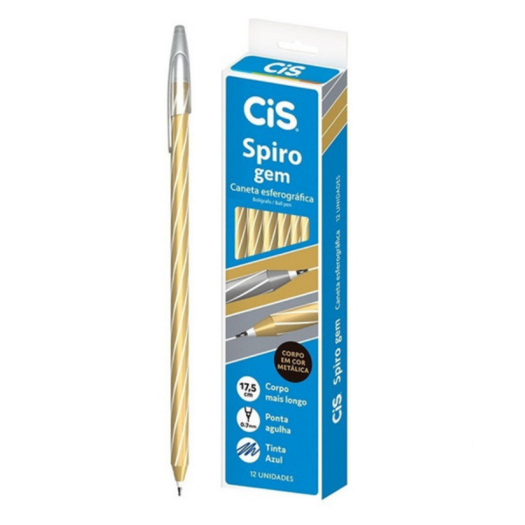 A Caneta Esferográfica CIS Spiro Gem é a queridinha do momento. Com uma ponta de 0,7mm, ela proporciona uma escrita macia, com traço fino e boa pigmentação da tinta. Por isso ela é um sucesso. Quem experimenta uma vez, quer sempre ter dela no estojo. Especificações: - Contém 12 canetas; - Cor da tinta: Azul; - Cores do corpo metálicas a escolher: Ouro/Prata - Tamanho da caneta: 17,5cm; - Caneta com corpo de plástico flexível; - Tintas nas cores do corpo; - Tampa ventilada com clip; - Ponta tipo agulha; - Esfera de aço inoxidável - 0.7mm.
