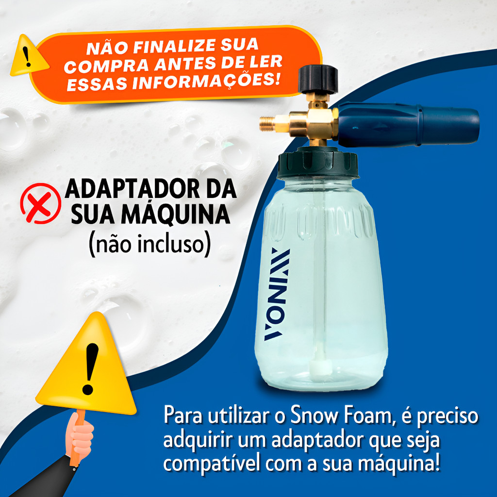 ATENÇÃO ANTES DE FINALIZAR SUA COMPRA LEIA ESSAS INFORMAÇÕES:O ADAPTADOR DE SUA MÁQUINA NÃO ESTÁ INCLUSO, ENTÃO PARA QUE A SNOW FOAM FUNCIONE É NECESSÁRIO ADQUIRIR SEPARADAMENTE O ADAPTADOR ESPECÍFICO DE SUA MÁQUINA, CASO CONTRÁRIO NÃO IRÁ FUNCIONAR.NOVA SNOW FOAM FAST PET CANHÃO DE ESPUMA 1L VONIXX AGORA VERSÃO TRANSPARENTE!!!!!A Snow Foam Fast Vonixx proporciona uma melhor performance durante o processo de lavagem automotiva. Auxilia na quebra de sujeiras acumuladas na pintura sem causar arranhões e swirls.Atenção : NÃO ACOMPANHA O ADAPTADOR PARA ACOPLAR A SNOW FOAM NA SUA LAVADORA DE ALTA PRESSÃO.- Requisitos de uso da Snow Foam Fast: Alcance PSI: 1000psi – 5000psi (Funciona com modelos a gás ou elétricos) GPM (galões por minuto): Mínimo de 1,7 GPM para melhores resultados de espumação.Características:- Marca: Vonixx- Modelo: Snow Foam Fast Pet- Cor: TransparenteEspecificações:- Capacidade do Reservatório: 1LMaterial:- Latão- Aço Inox- Plástico- PETInformações Adicionais:- Filtro universal para lavadora- Válvulas giclê aço inoxidável 1.1mm, 1.15mm e 1.3mm- Reservatório em PET 1L de alta densidade- ESPETACULAR AÇÃO DE ESPUMAÇÃO- INCLUSO ADAPTADOR 1/4- Fácil de usar- Bico Ajustável# Modo de Usar em Máquina de Lavar:1. Coloque fita de vedar canos nas roscas de encaixe na conexão do adaptador de latão.2. Fixe com firmeza o adaptador de latão ao canhão de espuma.3. Prenda o tubo de sucção transparente à ponta na parte inferior do canhão de espuma.4. Encha o recipiente com água e produto (para melhores resultados, use água morna, 20% produto + 80% água).5. Conecte o canhão de espuma ao recipiente.6. Faça isso devagar para reduzir o risco de danificar a rosca.7. Agite bem o recipiente para garantir uma mistura homogênea.8. Conecte o adaptador de conexão à lavadora de alta pressão e ajuste conforme necessário.# Ajustabilidade:- A válvula superior do canhão de espuma controla a quantidade de mistura que é dispensada.- Torcer o bico de pulverização frontal mudará o padrão de pulverização de largo para estreito.Conteúdo da Embalagem:- Reservatório Snow Foam Fast de 1L- Bico Aplicador- Guia Rápido# PRECAUÇÕESNão recomendado para uso em bombas de lavagem industrial e similares.# ATENÇÃO- A aplicação é de responsabilidade do consumidor.- O fabricante não se responsabiliza pela aplicação e pelo uso indevido da peça.- Imagens meramente ilustrativasEstamos à disposição para maiores informações e respostas para as dúvidas.Garantia de fábrica: 90 meses