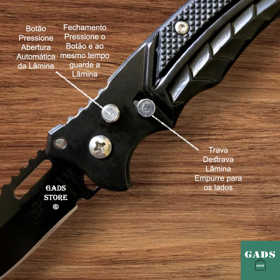 Canivete Automático Com Trava Militar Saque Rápido Aço Inox Preto 16cm Pesca Camping Trilha