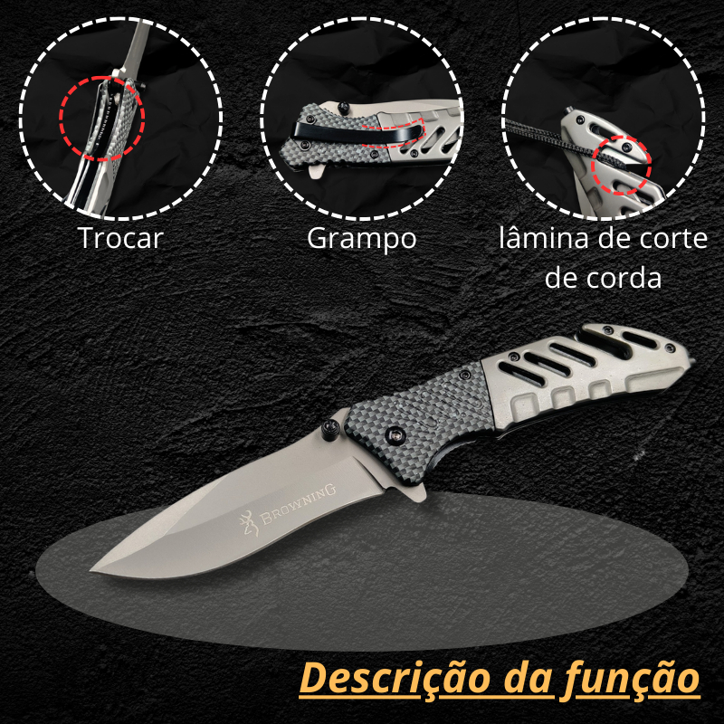 Marca: Browning Modelo: CJ-52 Cor : Cinza Tipo de fio da lâmina: Liso Forma da lâmina: Drop Material do punho:Aço Usos recomendados Sobrevivencia Acampamento Segurança Pesca Caça Material da lâmina Aço inoxidável Comprimento total 22 cm Comprimento da lâmina 10 cm Abertura da lâmina Semi-automática