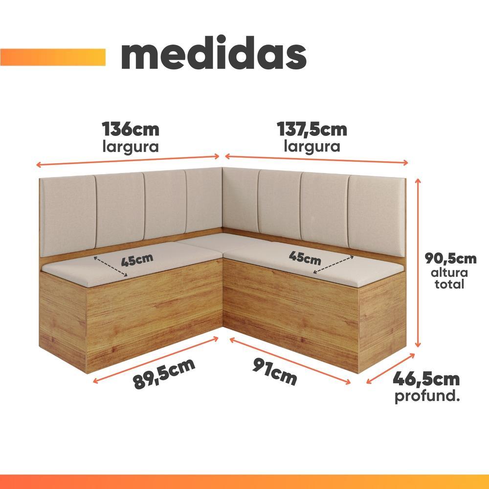 O Canto Alemão Liebe é a escolha perfeita para transformar sua cozinha ou sala de jantar com charme, funcionalidade e conforto. Com design inteligente, ele é ideal para ambientes compactos que não abrem mão da elegância. O canto possui baú interno, oferecendo praticidade e espaço extra para organização. Os assentos são acolchoados e revestidos em linho, proporcionando um toque macio e visual sofisticado. MEDIDAS: [ A ] = 90,5 cm [ L ] = 137,5 cm (maior) 136 cm (menor) [ P ] = 46,5 cm PESO: 69Kg PESO SUPORTADO: 90Kg por assento MODELO: Canto Alemão com Baú Liebe Veludo Viero MARCA: Viero ESTRUTURA: MDP ACABAMENTO: Semi Brilho TECIDO: Linho QUANTIDADE DE LUGARES : 4 a 3 lugares MATERIAL DO TAMPO: MDP DIFERENCIAL: Canto com Baú para armazenar itens, ótimo divisor de ambiente e revestido com veludo SISTEMA DE MONTAGEM: Parafusos e cavilhas ITENS INCLUSOS: 1 Canto Alemão, 1 manual de montagem e 1 kit parafusos INSTRUÇÕES E CUIDADOS: Limpar com pano levemente umedecido com água, não utilizar produtos abrasivos GARANTIA: 3 meses pelo fabricante Importante sobre a entrega: A entrega é realizada até a portaria ou porta de entrada do endereço indicado, desde que o acesso seja permitido. Para locais com portaria, a entrega será feita no piso térreo. Não realizamos montagem, desmontagem, transporte por escadas ou içamento. É responsabilidade do cliente verificar se as dimensões do produto são compatíveis com portas, elevadores e corredores. Evite imprevistos: confira todos os detalhes antes de concluir sua compra.