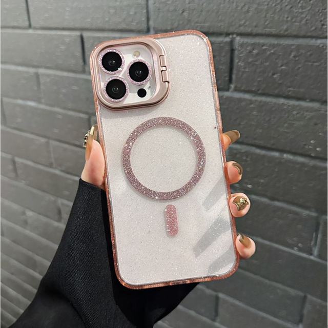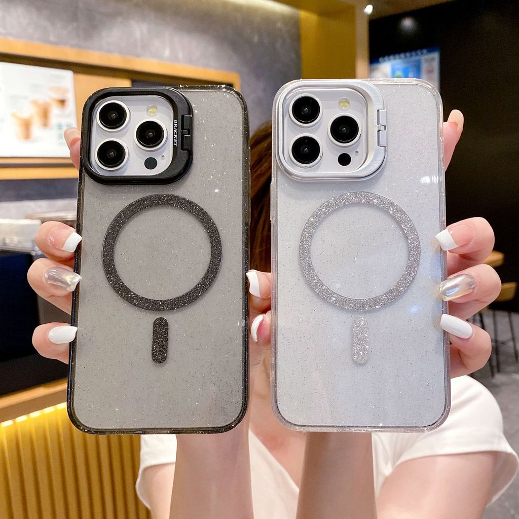 Capa Acrílico Transparente Glitter MagSafe Com Suporte + Película de Lente Anti Choque p iPhone 11 12 13 14 15 16 Promax
