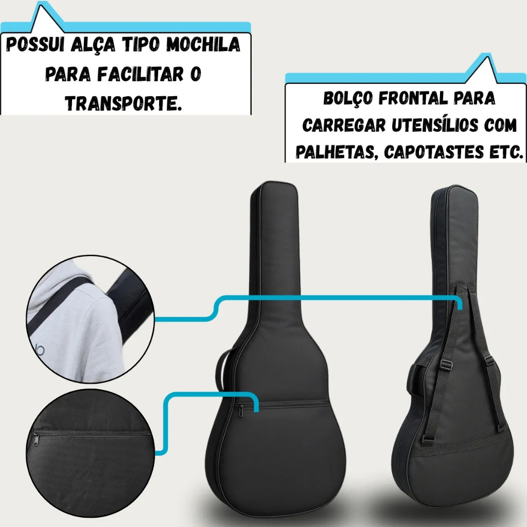 Capa Bag Acolchoada Para Violão Super Luxo Proteção Premium _______ ENVIO IMEDIATO PRODUTO EM ESTOQUE! • Entrega Segura e Ágil • Total Suporte no Pós-Vendas • Produto Original com Garantia do Fabricante ___ Capa Para Violão Extra Luxo 100% Acolchoada: Proteja seu violão com capa acolchoada de alta qualidade, ideal para todos os modelos de violão (acústico, eletroacústico e clássico). Nossa capa para violão com espuma reforçada oferece proteção contra impactos, riscos e poeira, garantindo que seu instrumento chegue seguro a cada viagem, escola, show ou ensaio. ___ Características principais: • Capa para violão com espuma acolchoada espessa para maior absorção de impactos • Compatível com violão todos os modelos (acústico, folk, clássico) • Material resistente, leve e durável • Alças confortáveis e alça de ombro ajustável para transporte fácil • Bolsos extras para acessórios (afinador, palhetas, cordas) • Fechos reforçados e costura de alta resistência ___ Perfeita para músicos iniciantes e profissionais que procuram proteção extra sem abrir mão da praticidade. Seja para guardar em casa, levar na mochila ou usar em viagens, esta capa garante segurança e conforto no transporte do seu instrumento. ___ • Modelo: Extra Luxo • Compatível com: Violão. • 100% Acolchoada (Corpo e Lateral) ___ Detalhes: • Alça de costa dupla almofadada, • Alça de mão plástica, • 1 bolso para acessórios, • Design teen. ___ Especificações: • Tecido nylon 600; • Forro TNT 40; • Isomanta de 5mm; • Ziper 6. _______ Capa Compatível com todos os Violões existentes no Mercado: • Capa Para Violão Strinberg • Capa Para Violão Tagima / Tagima Dallas • Capa Para Violão Malibu • Capa Para Violão Giannini • Capa Para Violão Michael • Capa Para Violão Eagle • Capa Para Violão Hofma • Capa Para Violão Memphis • Capa Para Violão Vogga • Capa Para Violão Benson • Capa Para Violão Takamine • Capa Para Violão Cort • Capa Para Violão Crafter • Capa Para Violão Yamaha • Capa Para Violão Epiphone • Capa Para Violão Ibanez • Capa Para Violão Gibson • Capa Para Violão Taylor _______ GARANTIA: • 90 dias contra defeitos de fabricação, (não incluso mau uso.) _______ ITENS INCLUSOS NA EMBALAGEM: • 01 Capa de Violão Super Luxo Estofada Para todos Violões • 01 Palheta de Brinde ___ OUTRAS INFORMAÇÕES: • Peso aproximado: 500g • Produto novo, original, com nota fiscal e garantia de 90 dias contra defeitos de fabricação. ___ • Postaremos o produto em até 24hrs após confirmação de pagamento. • Qualquer dúvida ficaremos contentes em responder. • Boas compras e volte sempre! ___ capa para violão, capa acolchoada para violão, capa com espuma, proteção violão, capa reforçada, gig bag violão, capa acústico, capa clássica, capa eletroacústico, acessório musical, case violão leve e resistente.