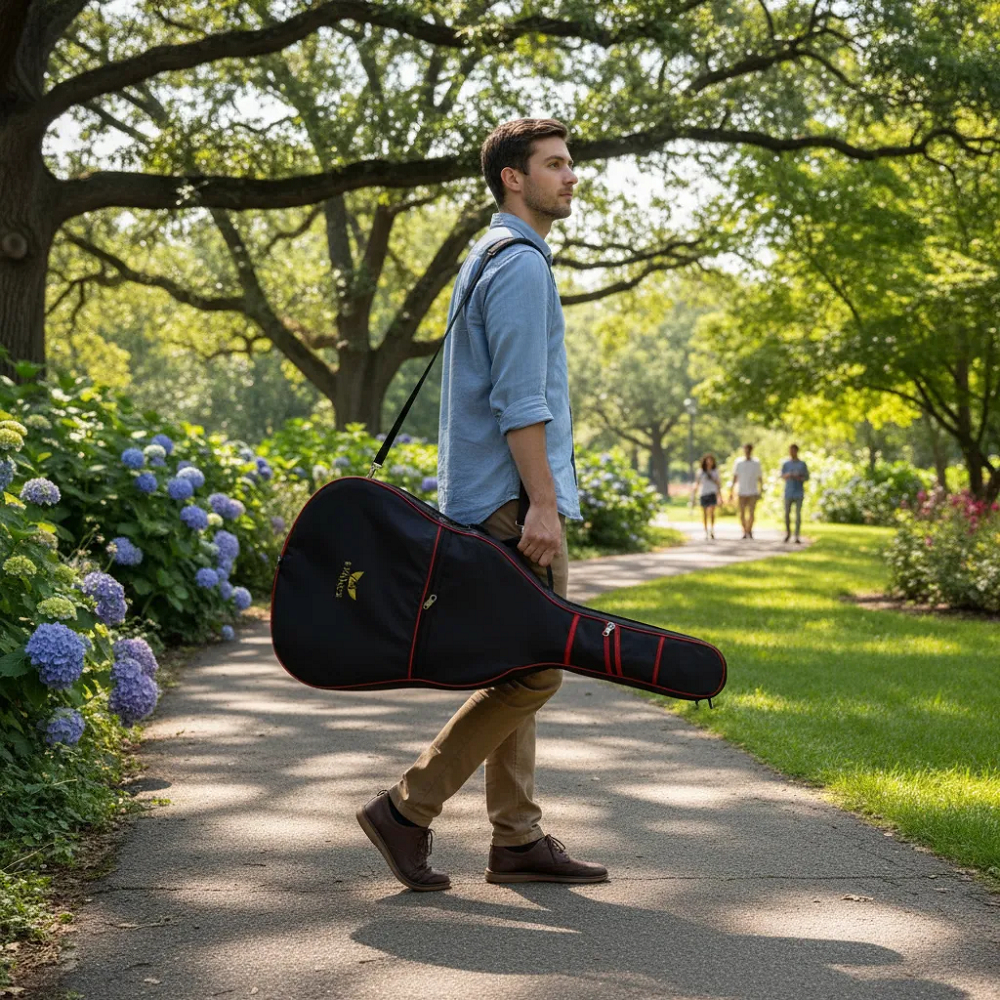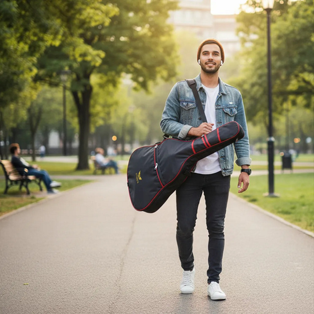 01 Capa Bag Violão Basic Line Reforçado Evance CARACTERÍSTICAS DO PRODUTO: *Nylon 600 Qualidade Superior, Extra Resistente, Emborrachado e Impermeável. *Alça tipo C.A 30mm Extra Resistente *Alça tipo mochila (Alça nas costa) *ZÍper inoxidável Reforçado N°8 *Alças nas Laterais para transporte MEDIDAS VIOLÃO FOLK/JUMBO COMPRIMENTO: 107 LARGURA: 43 - 45cm ALTURA: 13cm MEDIDAS VIOLÃO CLÁSSICO COMPRIMENTO: 104cm LARGURA: 39cm ALTURA: 11cm ***Imagens meramente ilustrativas*** Os instrumentos e acessórios não estão inclusos