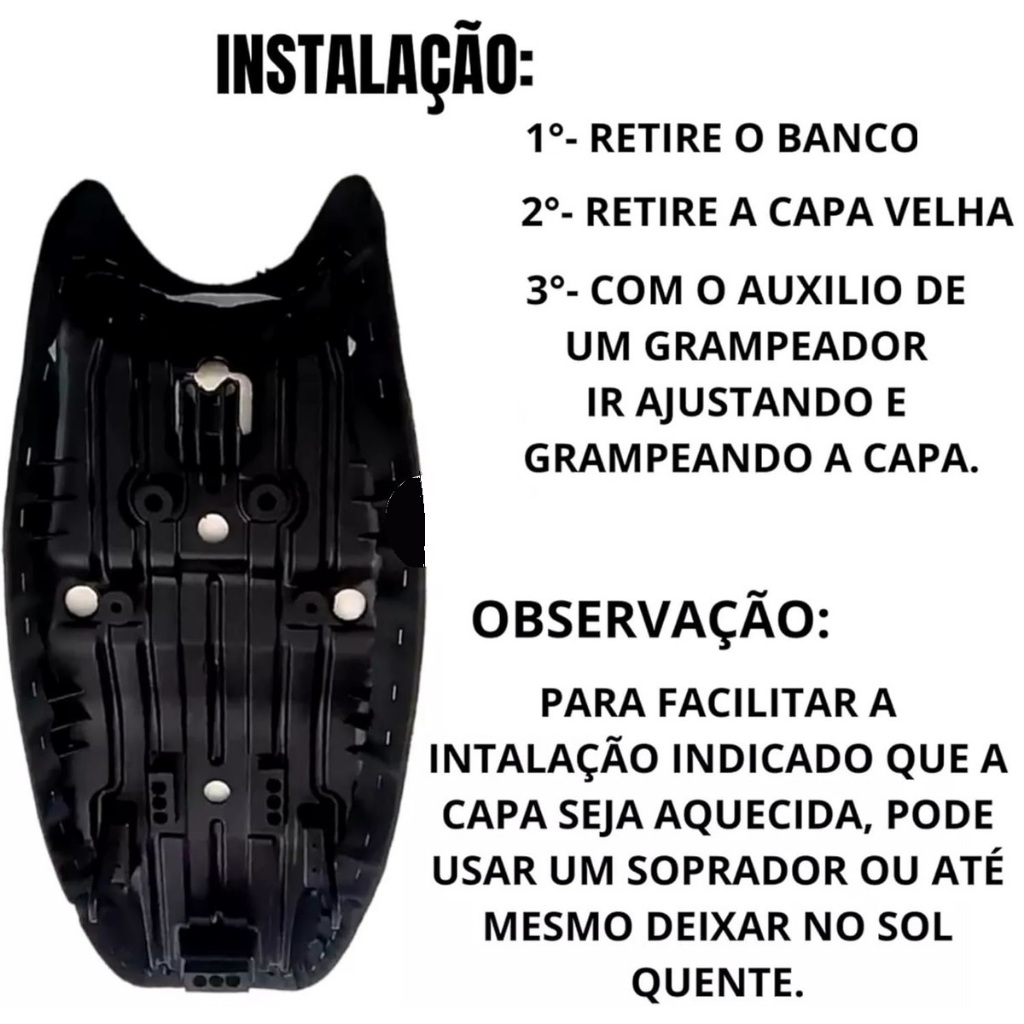 CAPA DE BANCO PARA HONDA LEAD 110 2009 - 2015. Precisa remover a original; Produto instalado com grampos como a original; Não possui elasticos;