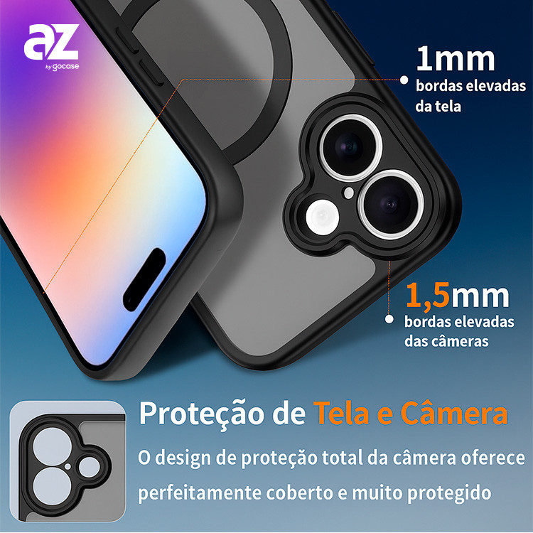 Capa Anti Impacto Gocase Touch Mag Plus Desenvolvida para iPhone 17 Capa de excelente qualidade e custo-benefício, desenvolvida com material de primeira linha. Produzida em policarbonato, oferece uma textura sofisticada e resistente. O design conta com bordas em TPU, garantindo proteção contra impactos e maior durabilidade. Compatível com carregadores MagSafe, proporciona praticidade no dia a dia sem abrir mão da segurança para seu dispositivo. Destaques: • Proteção da Câmera Aprimorada: Borda elevada de 1,5 mm que evita arranhões e danos nas lentes. • Proteção da Tela: Bordas frontais de 1 mm para segurança extra contra quedas e impactos. • Durabilidade Garantida: Material que não marca com impressões digitais e mantém o visual sempre limpo. • Compatível com Acessórios MagSafe: Funciona perfeitamente com carregadores, power banks, e suportes de carro magnéticos. • Design Confortável: Toque suave, firme nas mãos e sem volume excessivo. A escolha ideal para quem quer unir proteção, estilo e praticidade! As cases da AZ estão entre as melhores do mundo. Conecte-se com estilo! Não utilize produtos químicos abrasivos para higienizar a capa, inclusive álcool!