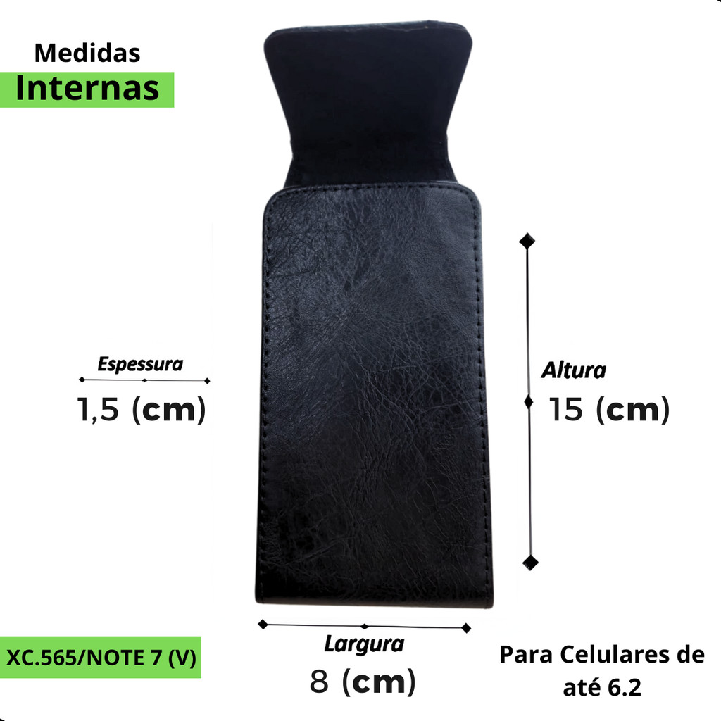 Capa de Cinta para Celular em Couro Sintético Vertical – Proteção e Estilo no Dia a Dia! Características principais: - Material premium: Fabricado em couro sintético de alta qualidade, oferece durabilidade e elegância. - Fechamento magnético: Proporciona praticidade e segurança no uso diário. - Clip com trava dupla: Garante uma fixação firme, protegendo seu celular contra quedas. - Proteção superior: Design reforçado para proteger seu smartphone contra impactos e riscos. - Interior macio: Acabamento aveludado que protege a tela do seu dispositivo contra riscos. - Design versátil: Lateral em elastano para acomodar diversos modelos de celulares. Dimensões: XC565NOTE7 Medidas internas: - Comprimento: 15 cm - Largura: 8 cm - Espessura: 1 cm Medidas externas: - Comprimento: 15,5 cm - Largura: 8 cm - Espessura: 1,5 cm Compatibilidade: A dequado para celulares de até 6,2 polegadas (15cm). Confira alguns modelos: Samsung: S3 Neo, S4, S5, S6, S6 Edge, S7, S7 Edge, S8, S8+, S9, S9+, S10e, S10, S20, S21, S22, S23, S24, J1, J2, J2 Prime, J3, J5, J7, J7 Pro, J7 Prime, J6, J6+, J8 Motorola: Moto G5, Moto G5S, Moto G6, Moto G7 Play, Moto G8 Play, Moto Z Play, Moto X4, Edge 40 Neo (6,2"), Edge 30 Neo Xiaomi: Mi 8 SE, Mi 9 SE, Mi 9, Redmi 7A, Redmi 8A, Redmi Note 7, Redmi Note 8, Iphone: Iphone 6, 6S, 7, 8, X, XS, 11 Pro, 12 Mini, 13 Mini, XR, 11, 12, 13, 14, 15 LG: G2, G3, G4, G5, G6, K22, Stylo 5, Stylo 5+, Velvet Destaque-se com uma capa prática, resistente e com excelente acabamento. Ideal para quem busca segurança e conforto sem abrir mão de estilo! *Atenção! - Geralmente se o aparelho já estiver com uma capinha, pode ser que não sirva dentro da Capa Carteira, por conta de aumentar o tamanho do celular.