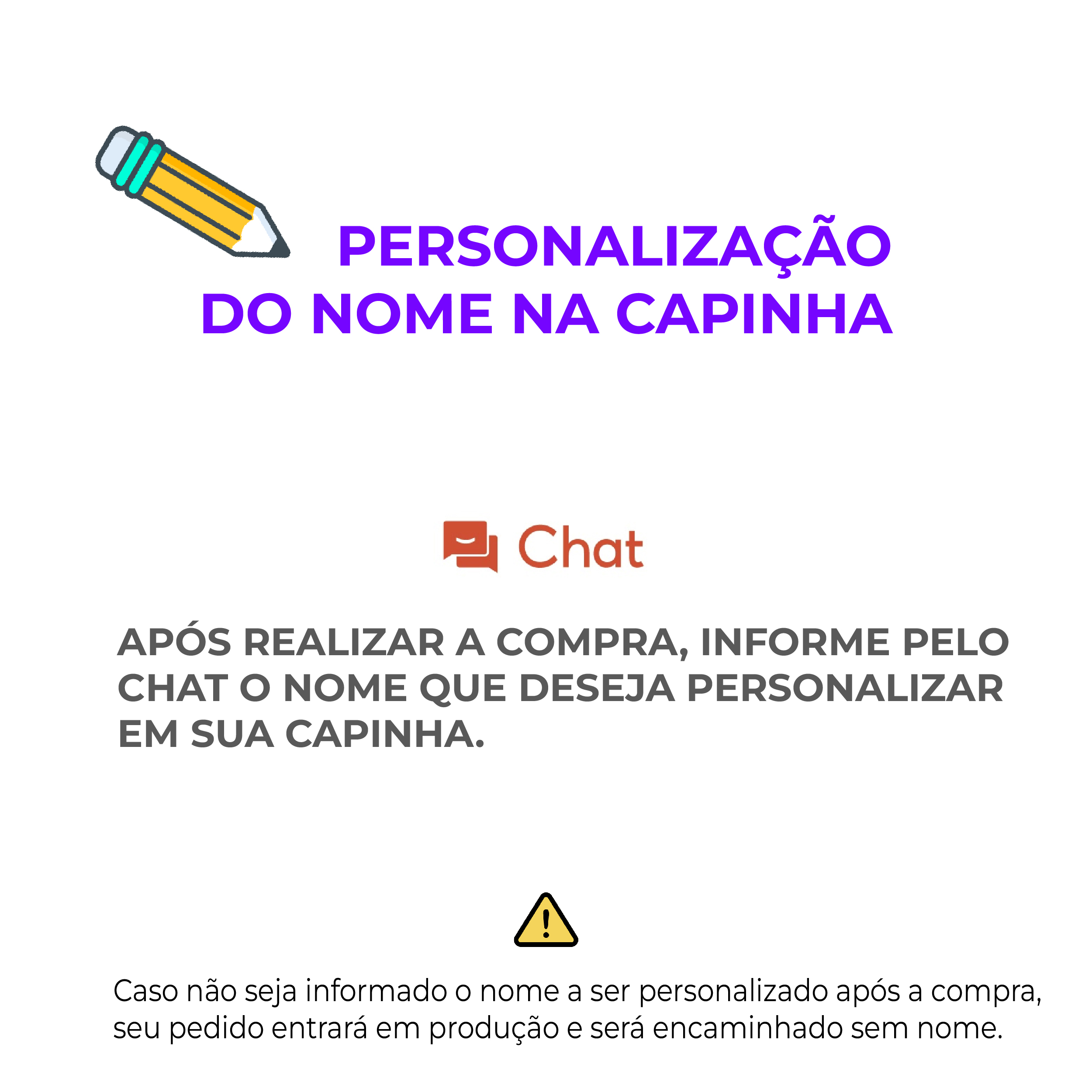 MATERIAL: TPU flexível transparente com proteção UV (3x mais durabilidade contra o amarelamento) PROTEÇÃO: Borda Anti-shock (Protege seu aparelho contra impactos) COMO REALIZAR SUA COMPRA: 1 - Escolha a quantidade de capinha que vai comprar; 2 - Ao Selecionar a quantidade basta clicar na numeração da arte da capinha escolhida; 3 - Confirme o modelo do seu celular no titulo do anuncio e nos confirme enviando pelo chat; 4 - Escolha se deseja com ou sem personalização, seleconando "Com nome" ou "Sem nome" 5 - Se a opção escolhida foi "Com nome", coloque o nome para personalizar nas observações do pedido ou nos envie pelo chat. IMPORTANTE: Capas com personalização que não forem enviadas o nome após a compra, serão encaminhadas sem personalzação, apenas com a estampa escolhida. Seu pedido entrará produção logo após a confirmação de pagamento, nos ENVIE pelo CHAT o NOME a ser PERSONALIZADO imediatamente após a compra . ATENÇÃO: • As imagens dos anúncios são ilustrativas, enviamos o modelo de capinha de acordo com à compra realizada no anúncio (Obs. verifique o titulo do anuncio). • É sempre importante realizar à compra no anúncio do modelo correto, assim evitamos cancelamentos e transtornos; • As Laterais da capinha sairão transparentes; • Após a confirmação do nome a ser personalizado, não há possibilidade de alteração; • Não fazemos alterações nas artes; RECOMENDAÇÕES Para limpeza de sua capinha, recomendamos sabão ou detergente neutro, sempre utilizando o lado amarelo e macio da esponja. Não deixar sua capinha de molho na água, não utilizar álcool ou outros produtos químicos para evitar prejudicar a arte impressa. COM DÚVIDAS? Estamos à disposição para ajuda-lo, nos envie uma mensagem pelo chat e entraremos em contato para te auxiliar assim que possível!