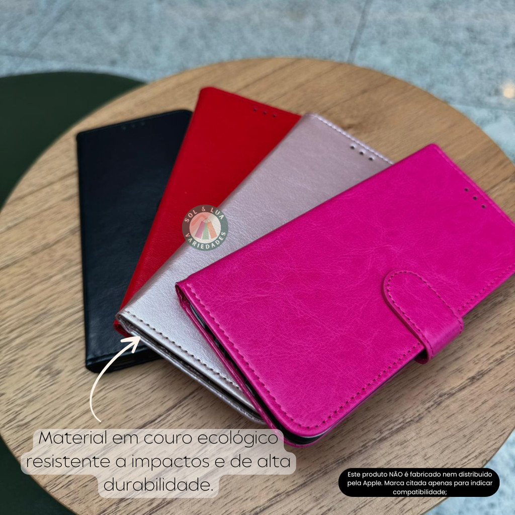 Nosso objetivo é sua satisfação. Estamos à sua disposição no chat para qualquer dúvida. ENVIO: Enviamos para todo o Brasil de forma rápida e segura via Correios e transportadoras. Este produto NÃO é fabricado nem distribuido pela Apple. Marca citada apenas para indicar compatibilidade; Informações do produto: - Criada para proteger e também dar um novo visual para o seu celular, a capa carteira de couro sintético, se adapta perfeitamente aos botões de volume, ao botão lateral e às curvas do aparelho sem ficar volumosa; - Na parte interna, há uma área para colocar cartões/documento/dinheiro e também uma proteção aveludada para proteger seu celular de arranhões e quedas; - O exterior em couro sintético, com toque sedoso e suave garante mais firmeza ao segurar o aparelho; - A capa permite que o celular fique em 45º possibilitando assistir vídeos de maneira confortável sem precisar segurá-lo. - Produto de alta qualidade e durabilidade. ATENÇÃO: a percepção das cores nas imagens dos produtos podem variar de acordo com a configuração do seu monitor ou da tela de seu celular.
