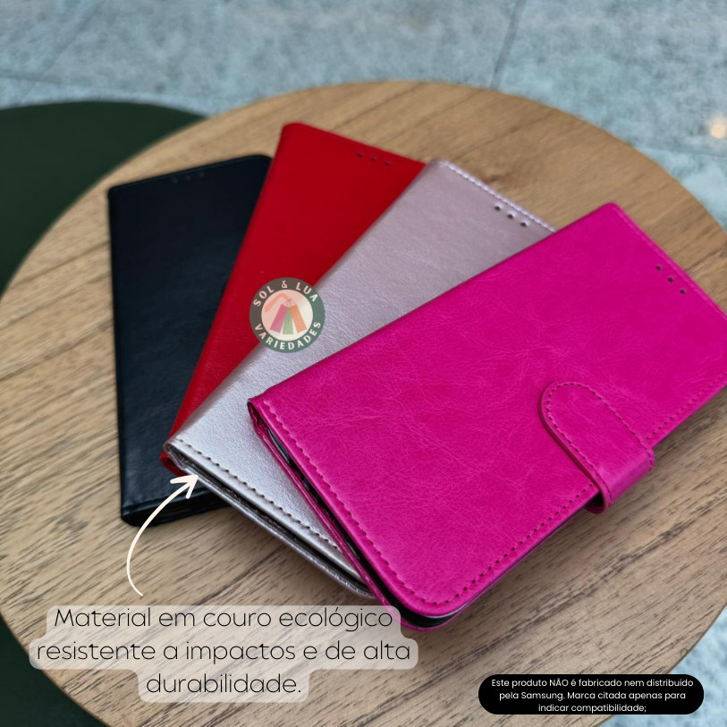 Nosso objetivo é sua satisfação. Estamos à sua disposição no chat para qualquer dúvida. ENVIO: Enviamos para todo o Brasil de forma rápida e segura via Correios e transportadoras. Este produto NÃO é fabricado nem distribuido pela Samsung. Marca citada apenas para indicar compatibilidade; Informações do produto: - Criada para proteger e também dar um novo visual para o seu celular, a capa carteira de couro sintético, se adapta perfeitamente aos botões de volume, ao botão lateral e às curvas do aparelho sem ficar volumosa; - Na parte interna, há uma área para colocar cartões/documento/dinheiro e também uma proteção aveludada para proteger seu celular de arranhões e quedas; - O exterior em couro sintético, com toque sedoso e suave garante mais firmeza ao segurar o aparelho; - A capa permite que o celular fique em 45º possibilitando assistir vídeos de maneira confortável sem precisar segurá-lo. - Produto de alta qualidade e durabilidade. ATENÇÃO: a percepção das cores nas imagens dos produtos podem variar de acordo com a configuração do seu monitor ou da tela de seu celular.