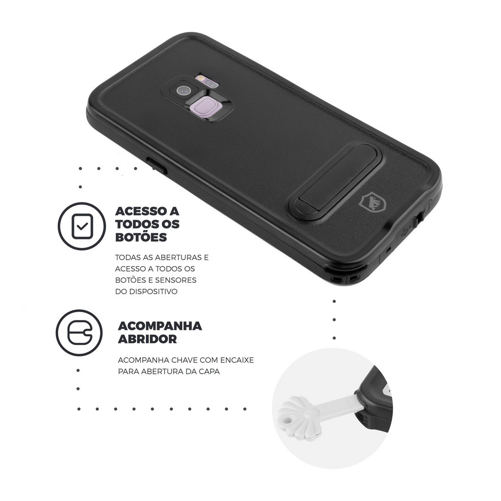 Use a melhor case para Samsung Galaxy S9 A Capa Prova D'água para Samsung Galaxy S9, da Gorila Shield, é ideal para quem gosta de ir à praia, ao clube ou escutar música no chuveiro. Com este acessório seu celular ficará protegido contra os respingos! Observação: A Capa a prova d"água foi projetada para suportar imersão em água por até 2 ATM durante 1 hora. ESPECIFICAÇÕES Material: Polipropileno de alta densidade - Não Amarela. Marca: Gshield Dimensões: Dimensões exatas do aparelho Proteção: Contra impactos e riscos à tela Certificações: Us Military Peso: 10G Não apropriada para o uso no dia a dia COMPATIBILIDADE Samsung Galaxy S9 ITENS INCLUSOS 1x Capa protetora