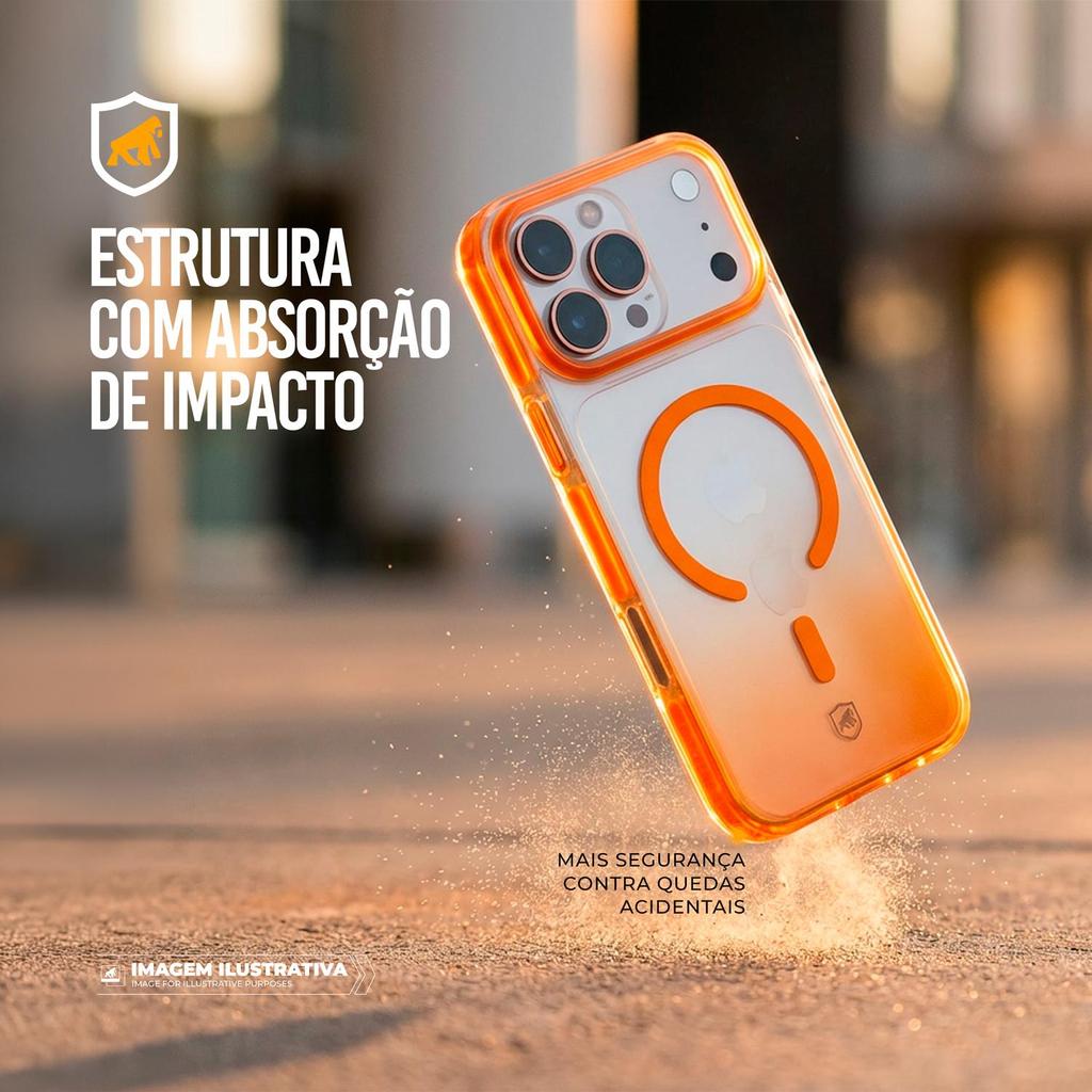 DESCRIÇÃO A Capa MagSafe Akroma da Gshield foi desenvolvida para oferecer proteção eficiente sem comprometer o visual do aparelho. Com um design translúcido e detalhes em laranja, ela destaca o smartphone enquanto adiciona uma camada extra de segurança para o uso no dia a dia. Sua estrutura combina materiais resistentes que ajudam a absorver impactos causados por quedas e batidas acidentais. As laterais reforçadas contribuem para dissipar a energia do impacto, reduzindo o risco de danos ao aparelho. Além disso, o design mantém a capa leve e com encaixe preciso, protegendo sem adicionar volume desnecessário. A capa conta com compatibilidade total com a tecnologia MagSafe, garantindo conexão estável com carregadores magnéticos e acessórios compatíveis. Isso permite carregar o dispositivo normalmente sem precisar remover a capa, oferecendo mais praticidade no uso diário. As bordas elevadas ajudam a proteger a tela e o conjunto de câmeras contra contato direto com superfícies, enquanto as laterais com textura proporcionam uma pegada mais firme e segura. O resultado é uma capa pensada para quem busca proteção, funcionalidade e estilo em um único acessório. Ideal para o dia a dia, a Capa MagSafe Akroma da Gshield une proteção contra impactos, compatibilidade com acessórios magnéticos e um visual marcante que valoriza o design do smartphone. ESPECIFICAÇÕES Marca: Gshield Material: Policarbonato e TPU Dimensões: Dimensões exatas do aparelho Proteção: Contra impactos e riscos Cor: Laranja COMPATIBILIDADE iPhone 17 Pro Max