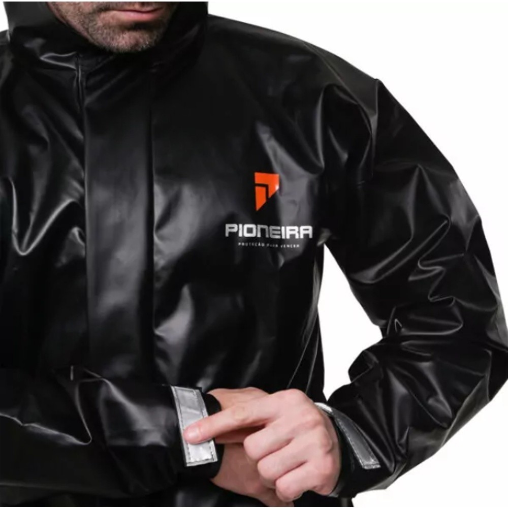 O nosso conjunto de PVC extra emborrachado! O produto é confeccionado em PVC 0,32mm que proporciona conforto, resistência e durabilidade. Jaqueta com fechamento através de zíper e velcro recobertos por uma lapela, capuz ou gola (gola e lapela rosa no feminino), bolso interno, regulador refletivo nos punhos, elástico na cintura da jaqueta, serigrafia e refletivo micro-prismático nas costas. Calça com elástico na cintura e zíper triângulo na bainha.