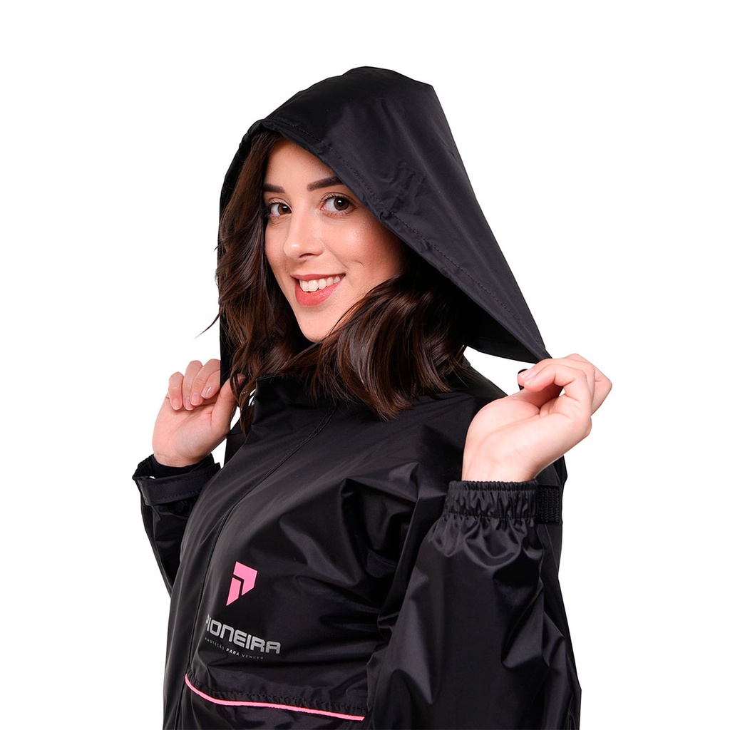 Capa Chuva Moto Pioneira Nylon Full Feminino Impermeável Gola Capuz Embutido Preta Conjunto Refletivo