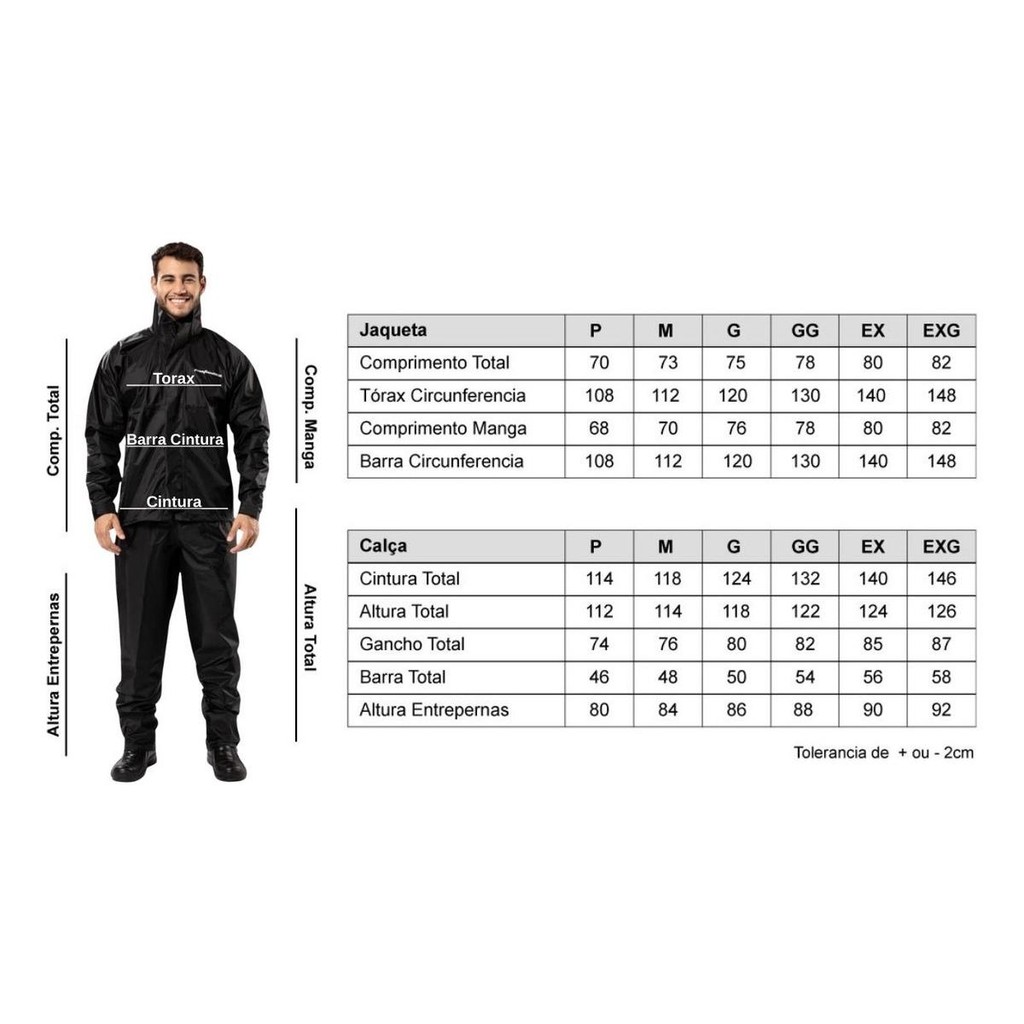 Capa De Chuva Para Motoqueiro Pantaneiro Nylon Com Gola A Pantaneiro desenvolveu este conjunto para chuva seguindo todas as necessidades dos motociclistas. Próprio para uso continuo ela apresenta grande resistência e durabilidade. Jaqueta de segurança confeccionada em nylon emborrachado com a parte externa em poliamida e parte interna revestida de PVC, com gola, fechamento frontal com zíper e vel-cro, punhos com vel-cro, costuras impermeabilizadas. Calça de segurança confeccionada em nylon emborrachado com a parte externa em poliamida e parte interna revestida de PVC, costuras impermeabilizadas e com elástico na cintura. Características: - Punhos com vel-cro - Espessura: 0.20 micras - Fechamento frontal com zíper e vel-cro - Com gola - Calça com elástico na cintura Tamanhos: - P / M / G / GG / EX / EXG ATENÇÃO! Verifique as medidas e selecione o tamanho desejado na hora da compra. Após a compra não será possível enviar um tamanho diferente do selecionado. MEDIDAS (aproximadas) tolerância de + ou - 2cm: JAQUETA: P / M / G / GG / EX / EXG Comp. Total: 70 / 73 / 75 / 78 / 80 / 82 Tórax circunferência: 108 / 112/ 120 / 130 / 140 / 148 Comp.Manga: 68 / 70 / 76 / 78 / 80 / 82 Barra Jaqueta circunferência: 108 / 112 / 120 / 130 / 140 / 148 CALÇA: P / M / G / GG / EX / EXG Cintura total: 114 / 118 / 124 / 132 / 140 / 146 Altura total: 112 / 114 / 118 / 122 / 124 / 126 Gancho total: 74 / 76 / 80 / 82 / 85 / 87 Barra total: 46 / 48 / 50 / 54 / 56 / 58 Entrepernas altura: 80 / 84 / 86 / 88 / 90 / 92 Altura da Pessoa: +/- 1,68+ / 1,70+ / 1,75+ / 1,80+ / 1,85+ / 1,90+ * PRODUTO ORIGINAL PANTANEIRO * Keywords: capa de chuva com gola, capa de chuva pantaneiro com gola, capa de chuva motoqueiro, capa de chuva motoqueiro com gola, capa de chuva pantaneiro nylon, capa de chuva motoqueiro nylon, capa de chuva nylon, capa de chuva motociclista, capa de chuva motoboy, capa de chuva pantaneiro, capa de chuva impermeável, capa de chuva, motoqueiro, motociclista, motoboy, pantaneiro, impermeável