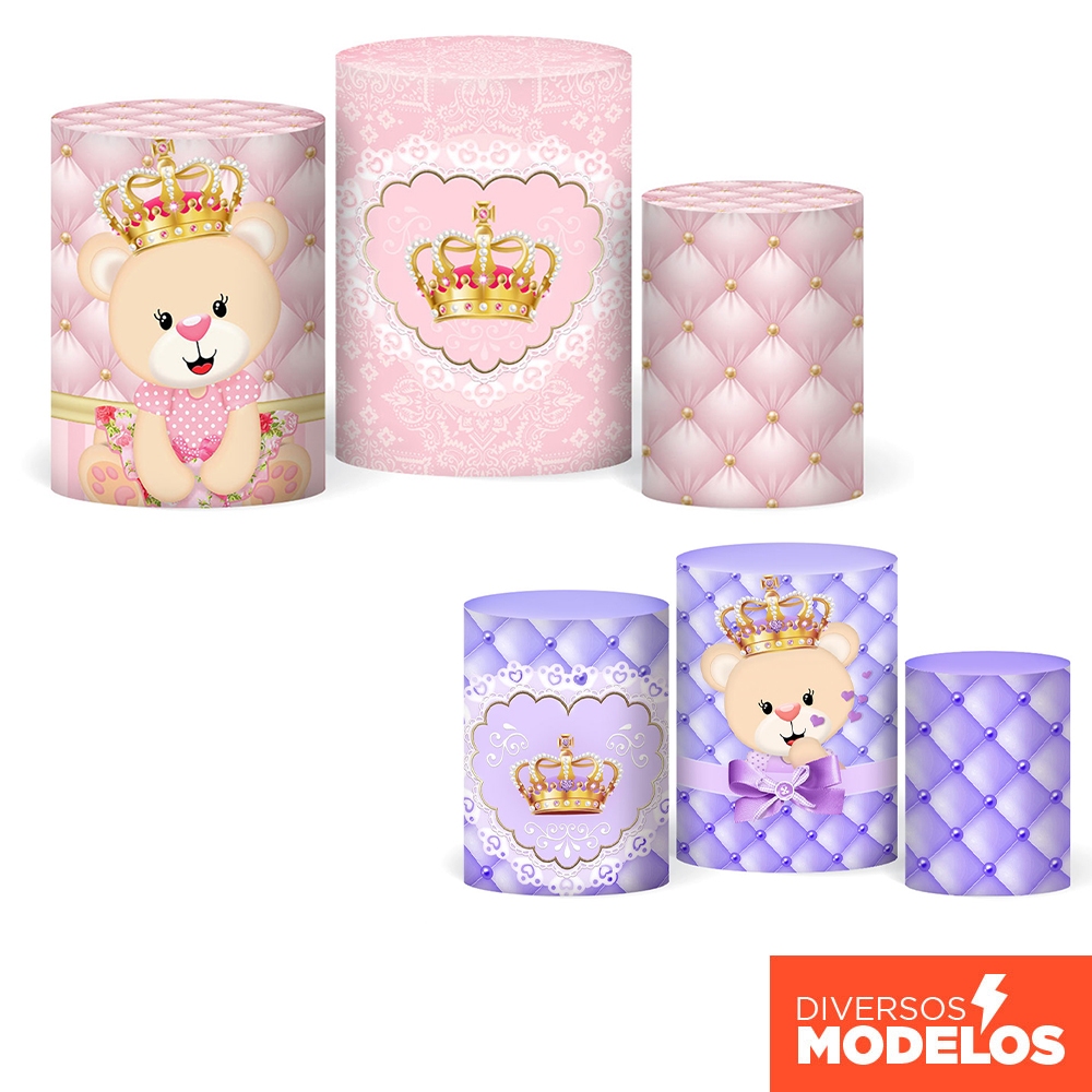 Capa Cilindro Festa Realeza Ursinha Decoração Aniversário Veste Fácil Em Tecido Com Elástico