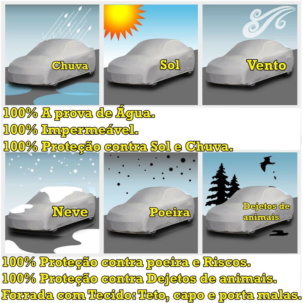 Proteja seu carro com a Nova Capa ZNA Bezz. A capa é forrada com tecido e impermeável, Desenvolvida exclusivamente para proteção do seu Automóvel, protegendo seu carro de Sol, Chuva, Riscos, Poeiras, Dejetos de animais. A Capa Automotiva Impermeável é fabricada polietileno que ajuda a manter a qualidade e durabilidade do seu veículo protegendo de qualquer Chuva, sujeira ou poeira externa. Capa no Tamanho adequado ao Carro que esta no Título do anuncio. Benefícios e descrição da capa: - Protege a Pintura contra riscos. - Capa 100% Impermeável. - Adequada para Garagens Descobertas ou Cobertas. - Protege seu Carro por inteiro. - Instalação Prática e Fácil. - Material 100% Polietileno - Material do forro 100% TNT, forro central. - Elástico interno Para Melhor fixação. - Proteção contra raios UV, Chuva, Poeira, Sujeiras, animais. - Reflete Luz solar. - Leve e resistente. Como colocar sua capa 1 - Coloque a capa com o carro limpo, seco e frio com antenas e acessórios recolhidos. Ao desembalar a capa desenrole no sentido do comprimento, a etiqueta vai ficar localizada na frente do veículo, e a arte interna da capa fica voltada para baixo 2 - Centralize e desfaça as dobras ao longo das laterais, até cobrir os retrovisores, puxe-a para barra até envolver o para-choque dianteiro. 3 - Faça o mesmo com o para-choque traseira. Finalize a operação ajustando sua descida nas laterais e centralizando-a. PRODUTO NOVO ENVIO IMEDIATO COM NOTA FISCAL COM GARANTIA