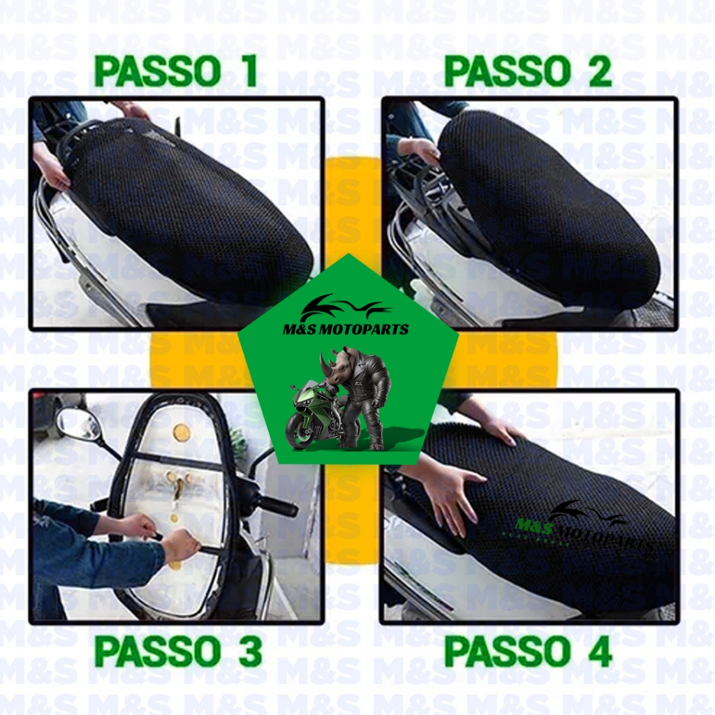 A capa é instalada em cima da capa existente sem danificá-la e é presa através de uma faixa de fixação. - Não esquenta o banco (pode deixar o dia todo no sol) - Permite a circulação do ar ( evita mofo ) - Impermeável ( mesmo na chuva não molha) - Material Anatômico (anti choque e confortável) - Anti derrapante ( fica fixo no banco ) - Anti bacteriana - Fácil Instalação - Protege seu banco original. ------------------------------------- TAMANHO G: Compatível com: HONDA - TITAN 150 - TODOS OS ANOS - TITAN 125 - TODOS OS ANOS - FAN 125 - TODOS OS ANOS - TITAN 160 - TODOS OS ANOS - FAN 160 - TODOS OS ANOS - CBX 250 TWISTER - CB 300 YAMAHA - CROSSER 150 - FAZER 250 - LANDER 250, - TENERE 250 - BROS - FACTOR - FAZER E Similares ------------------------------------------ TAMANHO GG: Compatível com: BROS 125 150 160 BIZ 100 125 110 JET 50 125 CB 300 CBX 200 STRADA CBX 250 TWISTER XTZ 125 LANDER 250 XRE 190 CB 300 XR 250 FAZER 250 XTZ 150/250 CROSSER E Similares --------------------------- TAMANHO EGG Compatível com: - Honda Pcx 160 - Honda Pop 100 110i - Honda Biz 100 110i 125 - Yamaha Nmax 160 - Yamaha Neo 125 Outros modelos scooters - NÃO É COMPATÍVEL. - Atenção! A INSTALAÇÃO DO PRODUTO É SIMPLES, PORÉM PARA EVITAR PROBLEMAS RECOMENDAMOS QUE A INSTALAÇÃO SEJA FEITA POR UM PROFISSIONAL DA ÁREA. Nós NÃO nos responsabilizamos pelo mau uso do produto. Esperamos que esta compra possa atender às suas expectativas. Gostaríamos que você avalia-se o produto como uma classificação de CINCO ESTRELAS. Esperamos que retorne em breve! Se você tiver alguma dúvida, temos uma equipe pronta para atender e sanar todas elas.