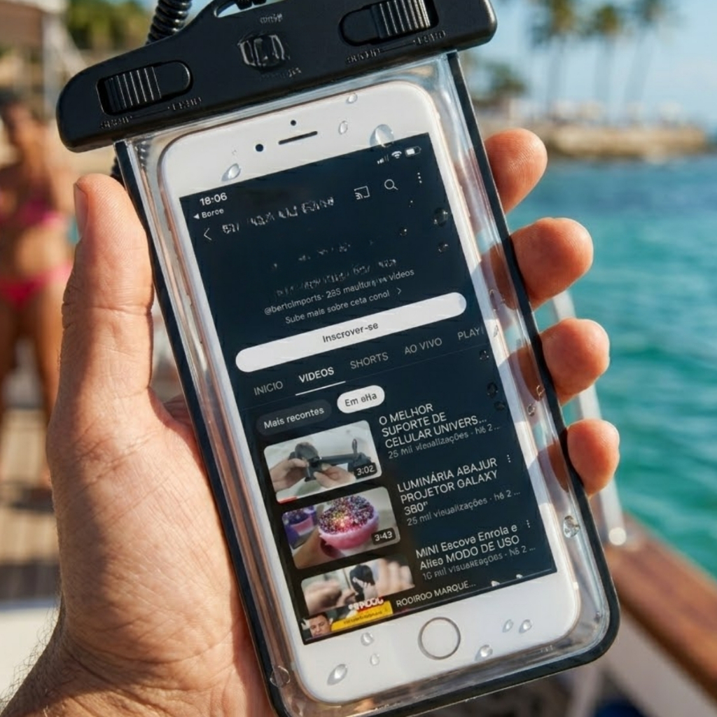 Capa de Celular Prova D'água Proteção Impermeável Capinha Transparente Bicicleta e Moto Universal Proteja seu celular contra água, areia e sujeira com praticidade e segurança em qualquer situação. Ideal para praia, piscina, chuva, trilhas ou uso diário, mantendo o aparelho protegido sem perder a funcionalidade da tela. Conteúdo da embalagem: 1 Capa impermeável para celular 1 Alça para pescoço Principais características: Material resistente com vedação segura Proteção contra respingos, chuva e contato com água Tela transparente que permite uso do touch normalmente Fechamento com trava reforçada Leve, prática e fácil de transportar Acompanha alça para maior segurança durante o uso Compatibilidade: Compatível com smartphones de até 6.8 polegadas Uso universal para diversos modelos Vantagens: Protege o celular em ambientes com água Permite usar o celular sem retirar da capa Ideal para praia, piscina, trilhas e atividades externas Mais segurança para fotos e uso em dias de chuva Fácil de levar para qualquer lugar Aplicações: Perfeita para uso em praia, piscina, passeios, pescarias, caminhadas e atividades ao ar livre. Atenção: Recomendado realizar teste de vedação antes do primeiro uso Evite exposição prolongada a altas temperaturas Certifique-se de fechar corretamente antes de usar