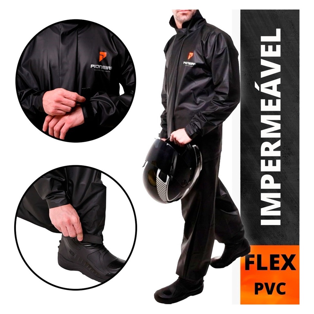 O melhor custo-benefício do mercado! O produto é confeccionado em PVC 0,28mm. Conta com calça e jaqueta. Jaqueta com fechamento através de zíper e velcro recobertos por uma lapela de drenagem, opções em gola, regulador nos punhos, serigrafia e refletivo nas costas. Calça com elástico na cintura e regulador em velcro na bainha. ---------OESTESOM--------- Tamanhos P, M, G, GG, XG 100% impermeável costuras seladas Material resistente Maleável para usar e guardar Couro Sintético Pvc Flex Segurança: Refletivos nas costas Conforto: Flexível com costuras seladas Cores: Preto Versão unissex ---------OESTESOM--------- TAMANHO P Altura - 1,58 Tórax - 116-120 Cintura - 100-102 TAMANHO M Altura - 1,64 Tórax - 120-124 Cintura - 104-106 TAMANHO G Altura - 1,70 Tórax - 124-128 Cintura - 106-110 TAMANHO GG Altura - 1,76 Tórax - 128-132 Cintura - 112-114 TAMANHO XG Altura - 1,82 Tórax - 132-136 Cintura - 116-118