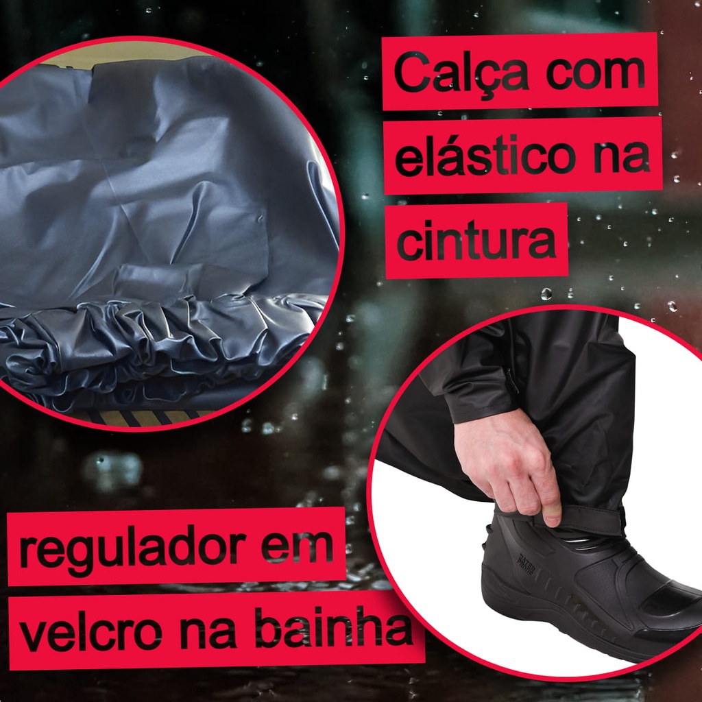 Conjunto de Chuva Pioneira PVC Combate Feminina com Jaqueta + Calça Impermeável (TAMANHO XG ) A Pioneira é marca que veio ao mercado para ficar, deixando a disposição uma linha de vestuário que se destaca pelo alto nível de conforto, durabilidade e relação custo-benefício. Nesse meio se destaca a Capa de Chuva modelo Combate em PVC, produto que vem com fabricação de ponta e design brasileiro que vai revolucionar o conceito de impermeáveis. Sua confecção é totalmente em PVC de 0,28mm de espessura, material que além de ser impermeável proporciona ao utilizador total conforto e proteção. Composto por Jaqueta e Calça a PVC Combate garante pontos que a tornam uma ótima escolha, tais como: zíper e velcro recoberto, gola, ajuastes tornozelos e punhos entre outros. Características: - Marca: Pioneira - Modelo: 2900-F-PRE-XG *imagens meramente ilustrativas Características Principais: - Tamanho: XG - Confecção: PVC 0,28mm; - Conforto, resistência, durabilidade impermeabilidade - Design discreto - Calça e Jaqueta não possuem forração interna - Características da Jaqueta: - Fechamento através de zíper e velcro recoberto por uma lapela de frenagem; - Gola - Regulagem por velcro nos punhos; - Sem forração interna - Não possui bolso interno - Características da Calça: - Elástico na cintura - Reforço no gancho - Sem bolso - Regulagem por velcro na bainha e vivo refletivo - Sem forração interna Conteúdo da Embalagem: - 1X Conjunto Capa de chuva Feminina Motoqueiro Tamanho GG PVC 0,28mm Combate Com Gola Preto Pioneira - 2900-F-PRE-XG