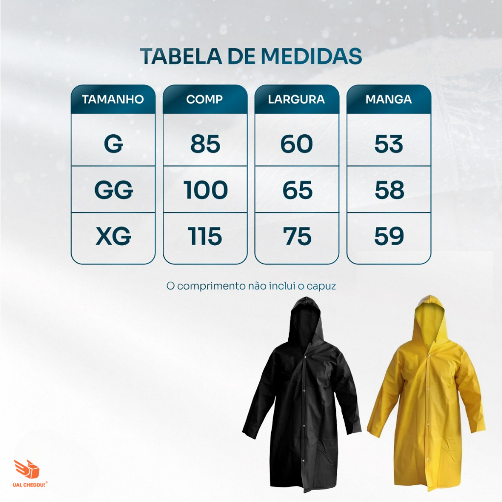 CAPA DE CHUVA IMPERMEÁVEL – LEVE E PRÁTICA PRINCIPAIS BENEFÍCIOS Proteção contra chuva leve e moderada. Leve e fácil de dobrar, ideal para transportar na bolsa ou mochila. Bom custo-benefício para uso urbano e viagens. O QUE VEM NO KIT 01 capa de chuva impermeável com capuz integrado. MATERIAL PVC leve e impermeável, fácil de limpar. INFORMAÇÕES IMPORTANTES Não possui bolsos. Capuz sem ajuste por cordão. Botões de pressão para fechamento frontal. Produto leve, indicado para uso casual (não recomendado para trabalhos pesados). O QUE NÃO ACOMPANHA Não acompanha capa para calçados. Não acompanha bolsa ou embalagem especial TROCAS E DEVOLUÇÕES Aceitamos devoluções conforme política do marketplace. Verifique as medidas antes da compra para evitar trocas. Palavras-chave: capa de chuva, capa impermeável, capa pvc, capa chuva adulto, capa impermeável adulto, capa chuva longa, capa chuva com capuz, capa chuva leve, capa chuva gg, capa chuva barata, capa chuva moto, capa chuva caminhada, capa chuva dobrável