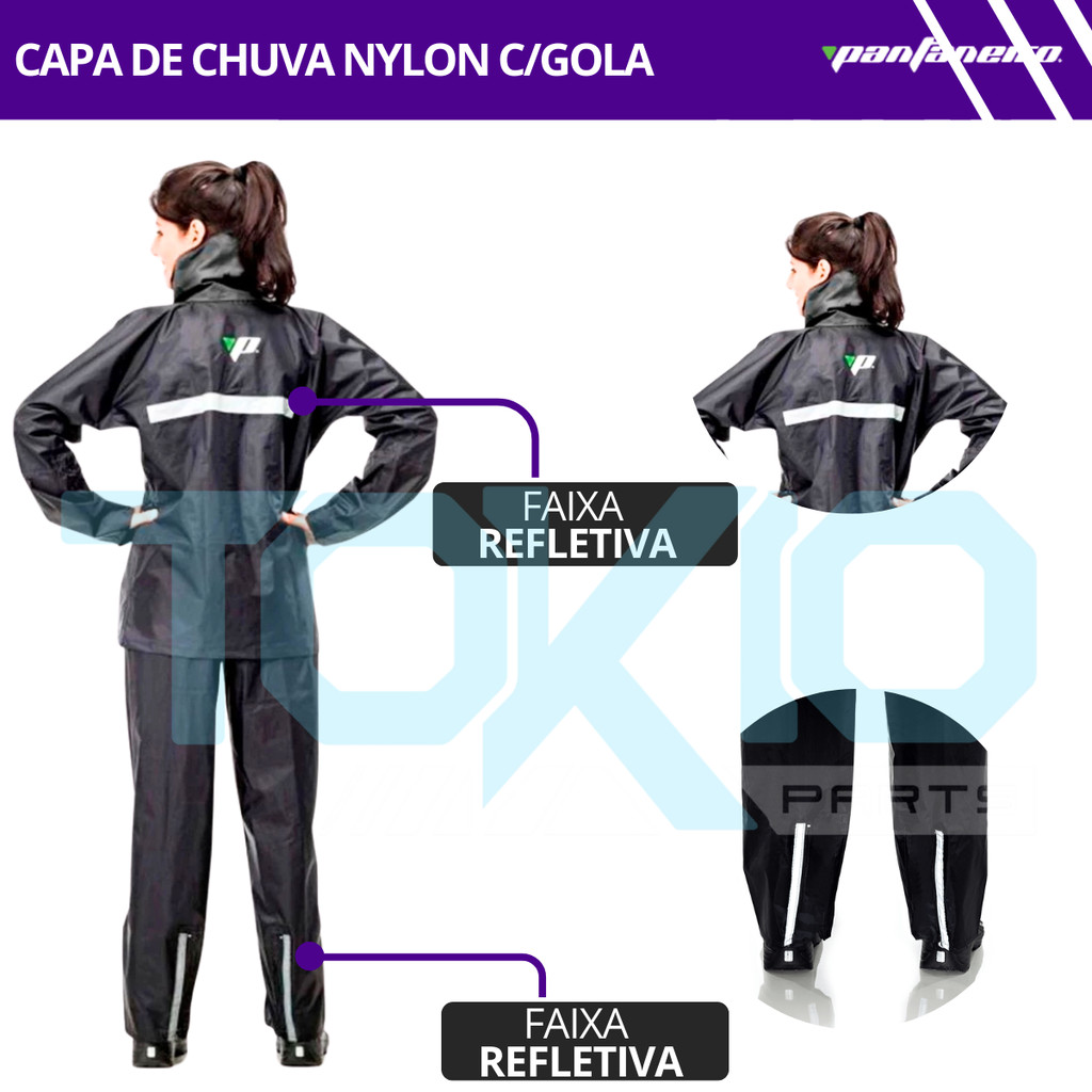 CAPA DE CHUVA NYLON FEMININO PANTANEIRO MOTOQUEIRA COM GOLA Jaqueta com bolso interno, cintura ajustada com elástico e punhos com elástico e velcro. Fechamento frontal com zíper e velcro. Refletivo nas costas e no velcro da calça. Com gola. Marca: PANTANEIRO Espessura: 0.20 Impermeável Costuras seladas Material resistente Fechamento em Zíper Velcro recoberto por lapela de drenagem Regulador de Punhos Não Acompanha bota FEMININO CONTEUDO DA EMBALAGEM: 01 - JAQUETA 01 - CALÇA ---------------------------------- - Envio no máximo em 24 horas úteis. - Produto 100% original. - Devolução sem custo para o cliente (dentro do prazo de 7 dias ou em caso de garantia).