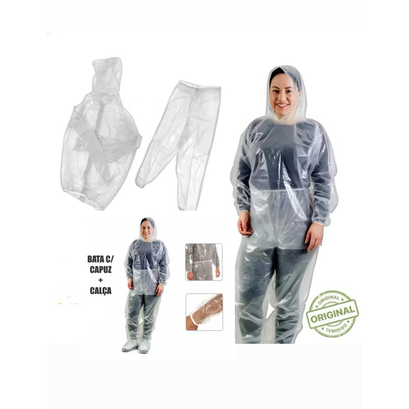 Capa de Chuva Transparente Com Calça e Capa Com Capuz da Prevemax. Possui elástico nas extremidades CA 30355 e CA 30354.