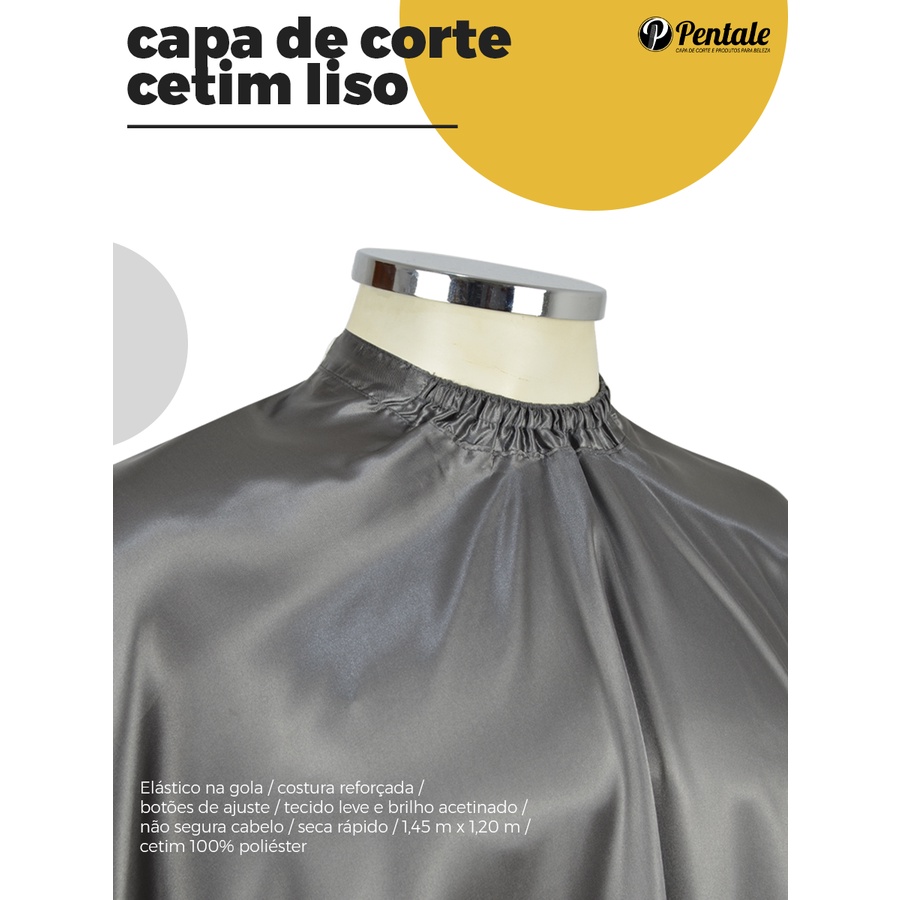 PENTALE ® - Capas de Corte e Produtos para Beleza *Desde 2009* -------------------------------------------------------------------------------------------- Capa de Corte para Cabeleireiro(a) / Barbeiro em Cetim *Qualidade no acabamento * Costura profissional* - Tecido Leve, brilho intenso, seca rápido e não segura cabelo - Botões para ajuste - Elástico na gola - Sem manga - Cetim / 100% Poliéster - 1,45 m comprimento x 1,20 m largura -------------------------------------------------------------------------------------------- LINK DA NOSSA LOJA COM TODOS OS PRODUTOS: www.shopee.com/pentale_capas -------------------------------------------------------------------------------------------- AGRADECEMOS SUA VISITA!