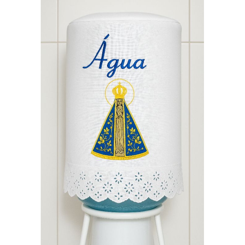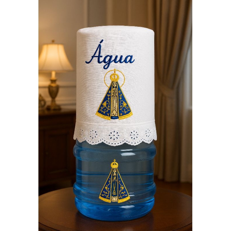 Capa de Galão de Água em Linho com Bordado Nossa Senhora Aparecida – Protetor Decorativo 20L com Renda