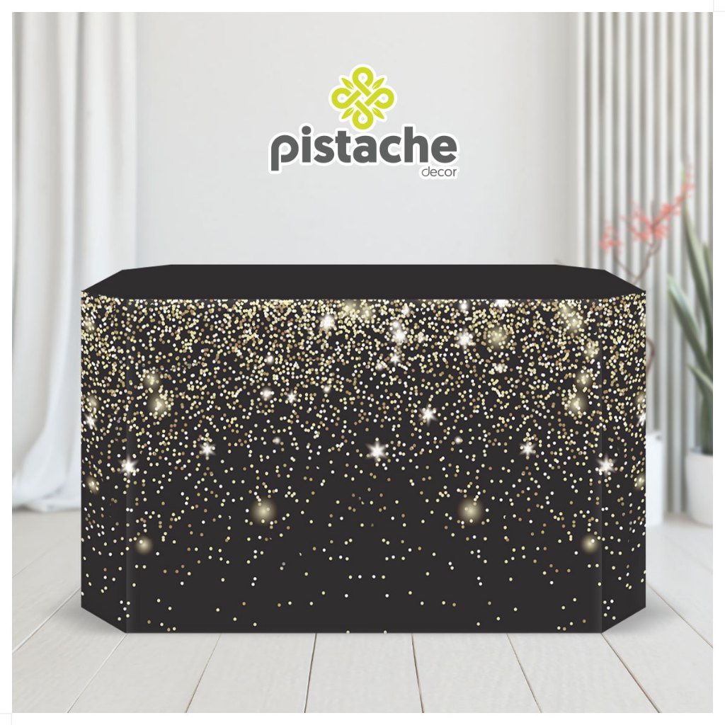 Capa De Mesa Festa Efeito Glitter Dourado Em Tecido Forro Veste Fácil Sublimado Decoração