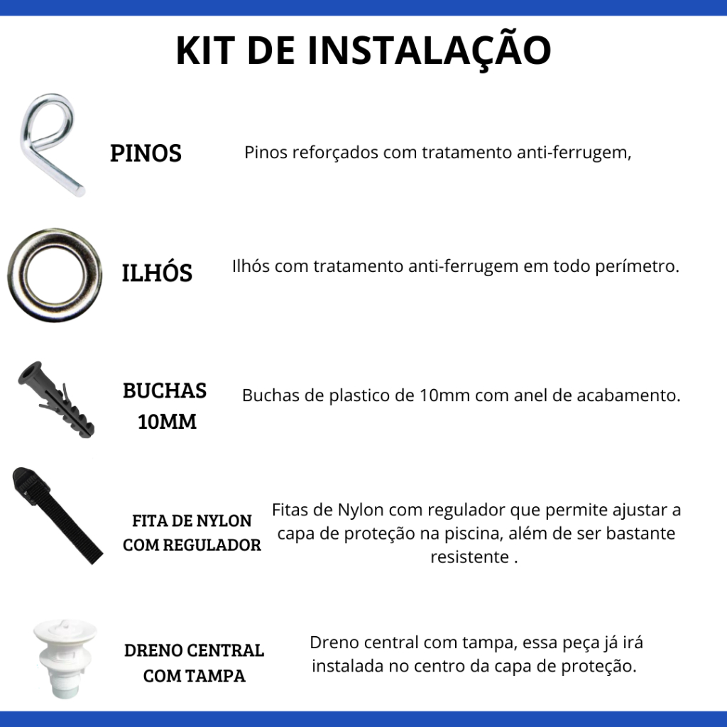 CAPA DE PVC, NÃO É POLIETILENO, NÃO DESFIA, MATERIAL EMBORRACHADO, QUALIDADE SUPERIOR. CAPA DE PROTEÇÃO (3,5 X 6,5) RECOMENDADA PARA PISCINAS DE (3 X 6) TODAS AS CAPAS POR SEGURANÇA DEVEM POSSUIR ACRÉSCIMO DE 50 CM NA LARGURA E COMPRIMENTO. EXEMPLO: SE A PISCINA POSSUIR O TAMANHO 4,00 X 8,00 DEVE COMPRAR A CAPA 4,50 X 8,50. A CAPA DE PROTEÇÃO VNEW 500 MICRAS É FEITA DE PVC EMBORRACHADO, ACOMPANHA KIT COMPLETO DE INSTALAÇÃO, CONTÉM BAINHA NO PERÍMETRO REFORÇADA COM 4 CAMADAS DE PVC, PROTEÇÃO CONTRA FUNGOS E BACTÉRIAS, TRATAMENTO ANTI-UV E ANTIOXIDANTE, O QUE AUMENTA A VIDA ÚTIL DO PRODUTO, MESMO EM CONDIÇÕES DE CHUVA E SOL. ECONOMIA DE PRODUTOS QUÍMICOS, EVITA A PROLIFERAÇÃO DO MOSQUITO DA DENGUE, PROTEGE CONTRA FOLHAS, INSETOS E POEIRA, AJUDA A MANTER A TEMPERATURA EM PISCINAS AQUECIDAS. A CAPA DE PROTEÇÃO, COM AS FITAS DE NYLON COM REGULADOR, SUPORTA O PESO DE UM ADULTO EM CASOS DE QUEDAS ACIDENTAIS NA PISCINA, PROPORCIONANDO MAIS RESISTÊNCIA, SEGURANÇA E DURABILIDADE, AJUSTÁVEL E SIMPLES DE INSTALAR. EMBALAGEM ACOMPANHA:. • CAPA DE PROTEÇÃO 500 MICRAS COR AZUL; • FITAS DE NYLON COM REGULADOR; • ILHÓIS ANTI FERRUGEM; • DRENO CENTRAL E TAMPA; • PINOS ANTI FERRUGEM; • BUCHAS 10MM; • MANUAL DE INSTALAÇÃO E INSTRUÇÕES; UTILIZE O CAMPO DE PERGUNTAS PARA SOLICITAR O TAMANHO DA SUA CAPA DE PROTEÇÃO E TIRAR DÚVIDAS. Perguntas frequentes: /Acompanha kit de instalação? – Sim, acompanha kit completo de instalação. / O dreno já vai instalado na capa? – Sim, o dreno já vem centralizado e instalado na capa./ Pode brincar em cima da capa? – Não é recomendado brincar ou subir na capa sem necessidade, a capa de proteção tem a função de evitar quedas acidentais na piscina. Qual a distância dos ilhós? – Os furos são de 80 a 100 cm, dependendo do tamanho da capa, mas sempre equidistantes. Qual a durabilidade? – Em média, 4 anos, se cuidada corretamente conforme o nosso manual de instruções. Qual peso suporta? – Até 150 kg, em casos de quedas acidentais na piscina. Qual a garantia? – Garantia de fábrica de 6 meses. VNEW PISCINAS