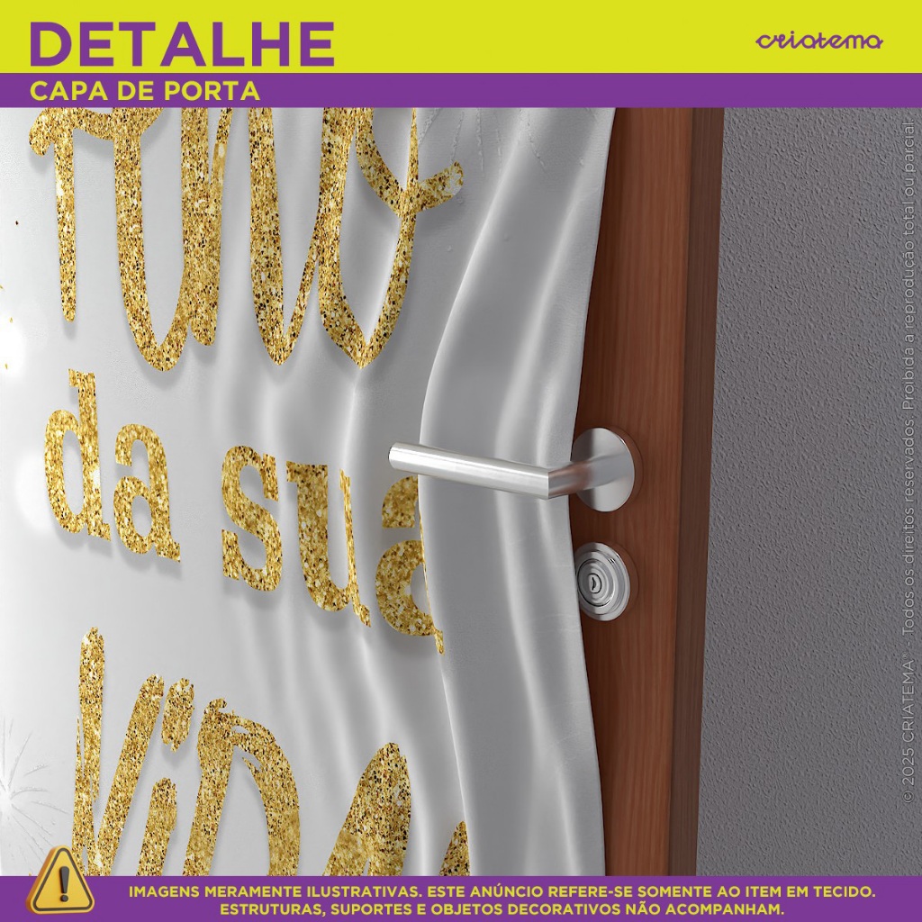 Painel Retangular Porta decorativo em Tecido fácil e prático de utilizar! Dê um toque especial com nossos produtos em tecido! Seja o anfitrião perfeito para sua festa ou simplesmente crie um ambiente temático em sua casa. Compre agora e transforme seu espaço inesquecível! MEDIDA DO PAINEL VERTICAL: >>> Tamanho Único - 0,85x2,10 com corte laser, evitando que seu produto desfie! >>> ATENÇÃO <<< Recomendamos o uso em portas na medida de 0,80cm de largura por 2,10cm de altura. BENEFÍCIOS DOS PAINÉIS CRIATEMA: • Arte Exclusiva. • Não amassa - tecido especial. • Não desbota, pode ser lavado quantas vezes desejar. • Alta durabilidade. • Não reflete luz. • Sem emenda. • Leve elasticidade • Acabamento à laser nas laterais. • Acabamento em elástico facilitando o encaixe DICA DE USO: • Decorações de casa nas portas. • Para ser fixado é muito fácil com elástico na parte superior e na parte inferior a fixação é em menos de 20 minutos! FICHA TÉCNICA: • Tecido Malha New (Que estica e não amassa). • Tecido Leve com ótimo caimento • Gramatura: 140g/m de excelente qualidade. • Composição do Tecido: 95% Poliéster e 5% de Elastano. • Elástico na parte superior e inferior. ITEM INCLUSO: 1 Capa de Painel Retangular em tecido com acabamento à laser e elástico. OBSERVAÇÃO: Todos os nossos produtos não acompanham estrutura/suporte. DÚVIDAS FREQUENTES: TRABALHAM COM PERSONALIZAÇÃO? Não! Nós optamos para uma melhor eficiência no processo de postagem do pedido, trabalharmos com produtos prontos. POSSUI GARANTIA? Nosso painel possui garantia contra defeito de fabricação. PRODUTO COM NOTA FISCAL? Todos os produtos acompanham de nota fiscal. >>> Tem alguma dúvida antes de finalizar sua compra? Envie uma mensagem para nós que ajudaremos você! <<<
