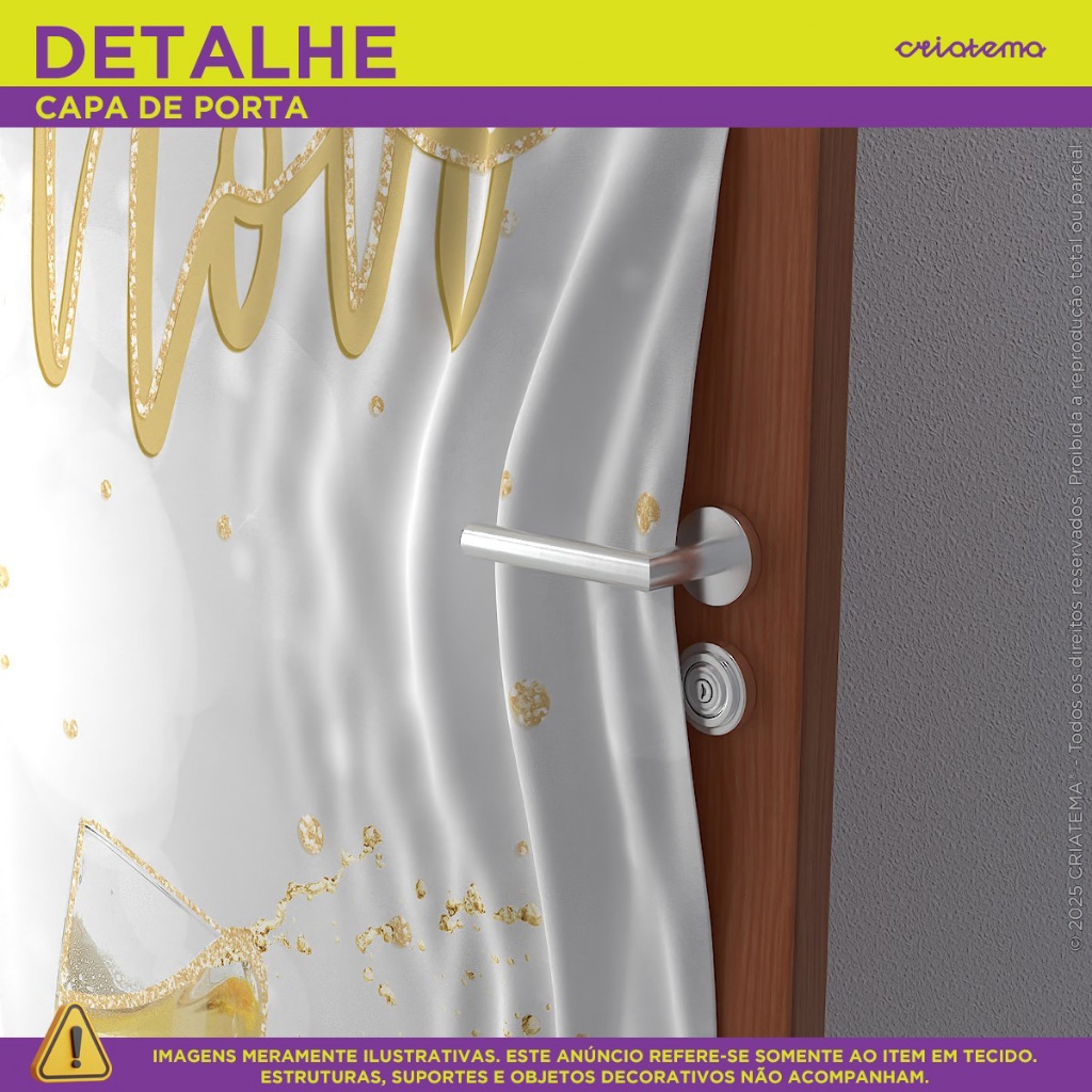 Painel Retangular Porta decorativo em Tecido fácil e prático de utilizar! Dê um toque especial com nossos produtos em tecido! Seja o anfitrião perfeito para sua festa ou simplesmente crie um ambiente temático em sua casa. Compre agora e transforme seu espaço inesquecível! MEDIDA DO PAINEL VERTICAL: >>> Tamanho Único - 0,85x2,10 com corte laser, evitando que seu produto desfie! >>> ATENÇÃO <<< Recomendamos o uso em portas na medida de 0,80cm de largura por 2,10cm de altura. BENEFÍCIOS DOS PAINÉIS CRIATEMA: • Arte Exclusiva. • Não amassa - tecido especial. • Não desbota, pode ser lavado quantas vezes desejar. • Alta durabilidade. • Não reflete luz. • Sem emenda. • Leve elasticidade • Acabamento à laser nas laterais. • Acabamento em elástico facilitando o encaixe DICA DE USO: • Decorações de casa nas portas. • Para ser fixado é muito fácil com elástico na parte superior e na parte inferior a fixação é em menos de 20 minutos! FICHA TÉCNICA: • Tecido Malha New (Que estica e não amassa). • Tecido Leve com ótimo caimento • Gramatura: 140g/m de excelente qualidade. • Composição do Tecido: 95% Poliéster e 5% de Elastano. • Elástico na parte superior e inferior. ITEM INCLUSO: 1 Capa de Painel Retangular em tecido com acabamento à laser e elástico. OBSERVAÇÃO: Todos os nossos produtos não acompanham estrutura/suporte. DÚVIDAS FREQUENTES: TRABALHAM COM PERSONALIZAÇÃO? Não! Nós optamos para uma melhor eficiência no processo de postagem do pedido, trabalharmos com produtos prontos. POSSUI GARANTIA? Nosso painel possui garantia contra defeito de fabricação. PRODUTO COM NOTA FISCAL? Todos os produtos acompanham de nota fiscal. >>> Tem alguma dúvida antes de finalizar sua compra? Envie uma mensagem para nós que ajudaremos você! <<<
