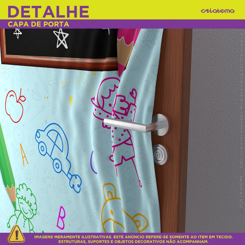 Painel Retangular Porta decorativo em Tecido fácil e prático de utilizar! Dê um toque especial com nossos produtos em tecido! Seja o anfitrião perfeito para sua festa ou simplesmente crie um ambiente temático em sua casa. Compre agora e transforme seu espaço inesquecível! MEDIDA DO PAINEL VERTICAL: >>> Tamanho Único - 0,85x2,10 com corte laser, evitando que seu produto desfie! >>> ATENÇÃO <<< Recomendamos o uso em portas na medida de 0,80cm de largura por 2,10cm de altura. BENEFÍCIOS DOS PAINÉIS CRIATEMA: • Arte Exclusiva. • Não amassa - tecido especial. • Não desbota, pode ser lavado quantas vezes desejar. • Alta durabilidade. • Não reflete luz. • Sem emenda. • Leve elasticidade • Acabamento à laser nas laterais. • Acabamento em elástico facilitando o encaixe DICA DE USO: • Decorações de casa nas portas. • Para ser fixado é muito fácil com elástico na parte superior e na parte inferior, a fixação é em menos de 20 minutos! FICHA TÉCNICA: • Tecido Malha New (Que estica e não amassa). • Tecido Leve com ótimo caimento • Gramatura: 140g/m de excelente qualidade. • Composição do Tecido: 95% Poliéster e 5% de Elastano. • Elástico na parte superior e inferior. ITEM INCLUSO: 1 Capa de Painel Retangular em tecido com acabamento à laser e elástico. OBSERVAÇÃO: Todos os nossos produtos não acompanham estrutura/suporte. DÚVIDAS FREQUENTES: TRABALHAM COM PERSONALIZAÇÃO? Não! Nós optamos para uma melhor eficiência no processo de postagem do pedido, trabalharmos com produtos prontos. POSSUI GARANTIA? Nosso painel possui garantia contra defeito de fabricação. PRODUTO COM NOTA FISCAL? Todos os produtos acompanham de nota fiscal. >>> Tem alguma dúvida antes de finalizar sua compra? Envie uma mensagem para nós que ajudaremos você! <<<