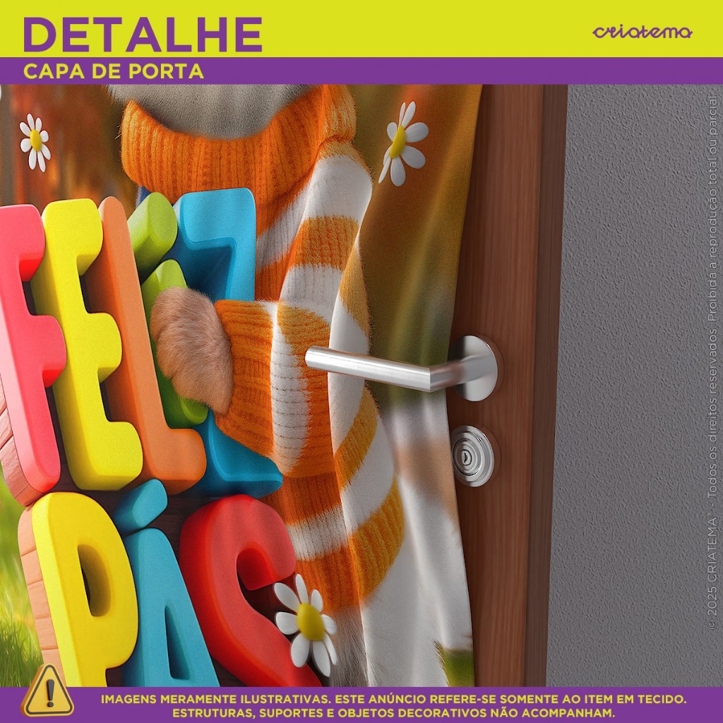 Capa de Porta Decorativa em Tecido Veste Fácil e prático de utilizar! Dê um toque especial com nossos produtos em tecido! Seja o anfitrião perfeito para sua festa ou simplesmente crie um ambiente temático em sua casa. Compre agora e transforme seu espaço inesquecível! >>> ATENÇÃO <<< Recomendamos o uso em portas na medida de 0,80cm de largura por 2,10cm de altura. BENEFÍCIOS DOS PAINÉIS CRIATEMA: • Arte Exclusiva. • Não amassa - tecido especial. • Não desbota, pode ser lavado quantas vezes desejar. • Alta durabilidade. • Não reflete luz. • Sem emenda. • Leve elasticidade • Acabamento à laser nas laterais. • Acabamento em elástico facilitando o encaixe DICA DE USO: • Decorações de casa nas portas. • Para ser fixado é muito fácil com elástico na parte superior e na parte inferior a fixação é em menos de 20 minutos! FICHA TÉCNICA: • Tecido Malha New (Que estica e não amassa). • Tecido Leve com ótimo caimento • Gramatura: 140g/m de excelente qualidade. • Composição do Tecido: 95% Poliéster e 5% de Elastano. • Elástico na parte superior e inferior. ITEM INCLUSO: 1 Capa de Painel Retangular em tecido com acabamento à laser e elástico. OBSERVAÇÃO: Todos os nossos produtos não acompanham estrutura/suporte. DÚVIDAS FREQUENTES: TRABALHAM COM PERSONALIZAÇÃO? Não! Nós optamos para uma melhor eficiência no processo de postagem do pedido, trabalharmos com produtos prontos. POSSUI GARANTIA? Nosso painel possui garantia contra defeito de fabricação. PRODUTO COM NOTA FISCAL? Todos os produtos acompanham de nota fiscal. >>> Tem alguma dúvida antes de finalizar sua compra? Envie uma mensagem para nós que ajudaremos você! <<<