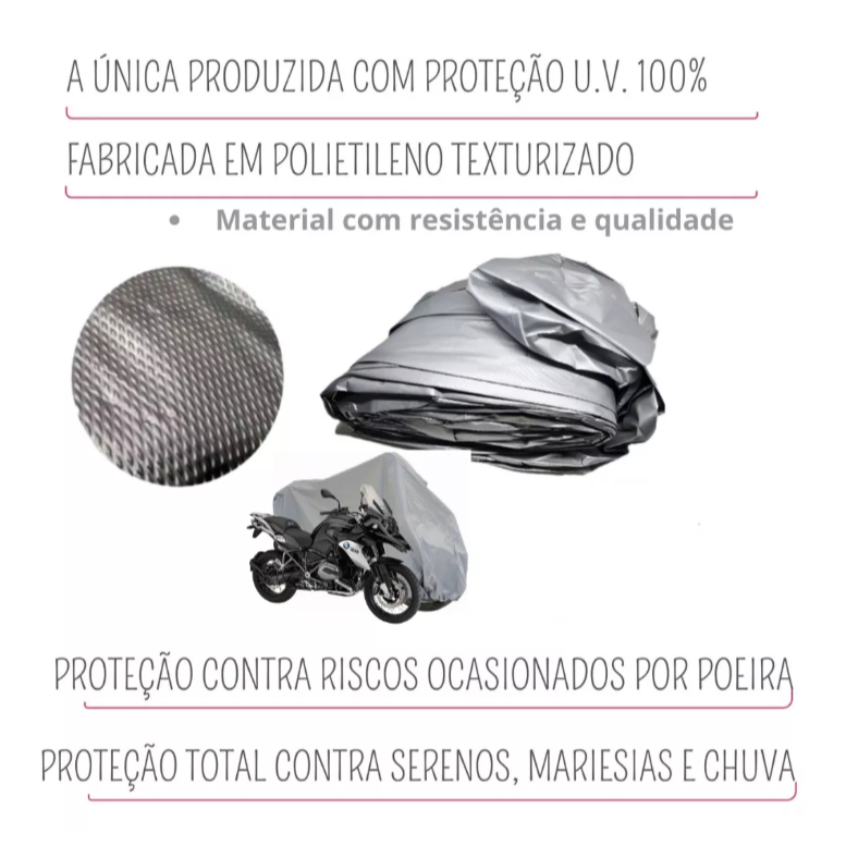 Capa para cobrir moto tamanho único anti risco Fabricada com material de ótima qualidade, e com a mais moderna tecnologia. Possuem elásticos em toda sua borda, facilitando sua colocação e fixação. Feita em tecido plástico que protege a moto dos raios ultra violeta do sol. Serve para motos, scooters e motonetas. Tamanho único: 2,20m de comprimento 1,15m de largura 1,15m de altura Recomendada para quem tem um zelo maior pela sua moto, com ela você pode proteger seu bem material contra agentes que danificam a pintura e o verniz da lataria da sua moto. Maior durabilidade da cor original da lataria. - pode ser usada em garagem coberta e descoberta - protege sua moto do sol, chuva, dejetos de aves e poeira - máxima proteção contra raios solares u.V. - conserva a pintura da sua moto por mais tempo - manuseio fácil e prático - impermeável Capa para cobrir moto tamanho único anti risco Fabricada com material de ótima qualidade, e com a mais moderna tecnologia. Possuem elásticos em toda sua borda, facilitando sua colocação e fixação. Feita em tecido plástico que protege a moto dos raios ultra violeta do sol. Serve para motos, scooters e motonetas. Tamanho único: 2,20m de comprimento 1,15m de largura 1,15m de altura Recomendada para quem tem um zelo maior pela sua moto, com ela você pode proteger seu bem material contra agentes que danificam a pintura e o verniz da lataria da sua moto. Maior durabilidade da cor original da lataria. - pode ser usada em garagem coberta e descoberta - protege sua moto do sol, chuva, dejetos de aves e poeira - máxima proteção contra raios solares u.V. - conserva a pintura da sua moto por mais tempo - manuseio fácil e prático - impermeável Composição: -100% polietileno Cuidados especiais e conservação: - a moto deverá estar fria, limpa e seca ao colocar a capa - somente lavagem manual A capa não poderá ser usada quando: - a moto estiver molhada. - em moto recém pintada e que não tenha passado por estufa. Conteúdo da embalagem: 01 capa 01 embalagem plástica Cor única: grafite Composição: -100% polietileno Cuidados especiais e conservação: - a moto deverá estar fria, limpa e seca ao colocar a capa - somente lavagem manual A capa não poderá ser usada quando: - a moto estiver molhada. - em moto recém pintada e que não tenha passado por estufa. Conteúdo da embalagem: 01 capa 01 embalagem plástica Cor única: grafite
