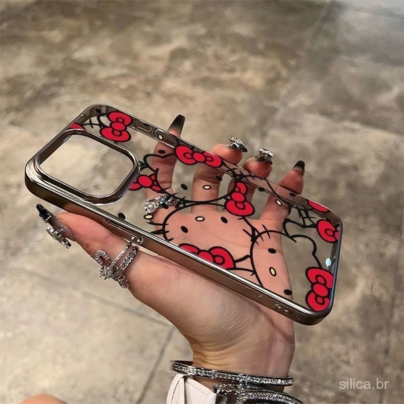 Capa de telefone transparente bonito com laço de tela cheia com padrão Hello Kitty para iPhone xr x xs 11promax 11 12 13 pro max 14promax 15promax 14 15 plus 8plus Capa de telefone metálico
