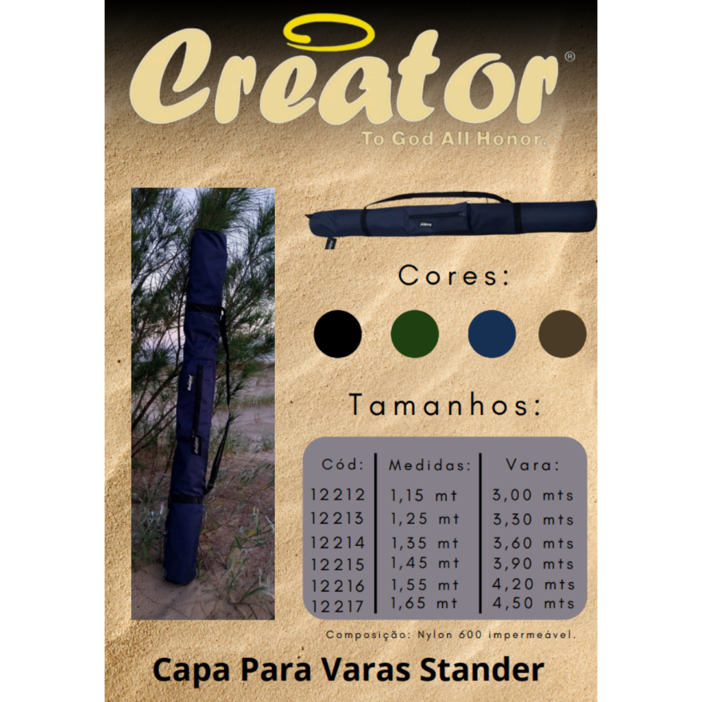 Capa Bolsa Standard P/ Varas Todos Metros E Cores Creator Proteja suas varas de pesca com estilo, praticidade e total segurança com a Capa Bolsa Standard da Creator. Com tamanhos variados disponíveis e cores, este porta varas atende a todas as suas necessidades. Fabricada com materiais de alta resistência, ela garante máxima proteção contra impactos, poeira, umidade e riscos do transporte diário. Seu acabamento reforçado proporciona durabilidade excepcional, suportando o uso constante em diversas condições. Além da robustez, a capa oferece qualidade superior em cada detalhe: zíperes resistentes, costuras firmes e design funcional, ideal para Varas de 3 partes e claro sendo assim, facilitando o armazenamento e transporte das suas varas de forma eficiente e segura. Seja em pescarias ocasionais ou expedições frequentes, a Capa Bolsa Standard da Creator é a escolha certa para quem valoriza resistência, qualidade e praticidade em um só produto. Tamanhos Disponíveis: - Capa: 1,15mts / Vara: 3,00mts - Capa: 1,25mts / Vara: 3,30mts - Capa: 1,35mts / Vara: 3,60mts - Capa: 1,45mts / Vara: 3,90mts - Capa: 1,55mts / Vara: 4,20mts - Capa: 1,65mts / Vara: 4,50mts Cores Disponíveis: - Azul - Preto - Verde - Marrom Especificações: - Produzida em Nylon 600 impermeável de alta resistência ( a prova d'água ); - Alças para transporte reguláveis; - Bolso Lateral em alto relevo; - Ziper BNY ( O melhor do mercado ); - Tampas laterais produzidas com vivo para dar maior sustentação a capa; - Modelo: Standard - Tamanho: Ao Critério do Cliente - Diâmetro: 13cm - Material: Nylon 600 Super Resistente - Cor: Ao Critério do Cliente PRODUTO EM ESTOQUE. ENVIO IMEDIATO.