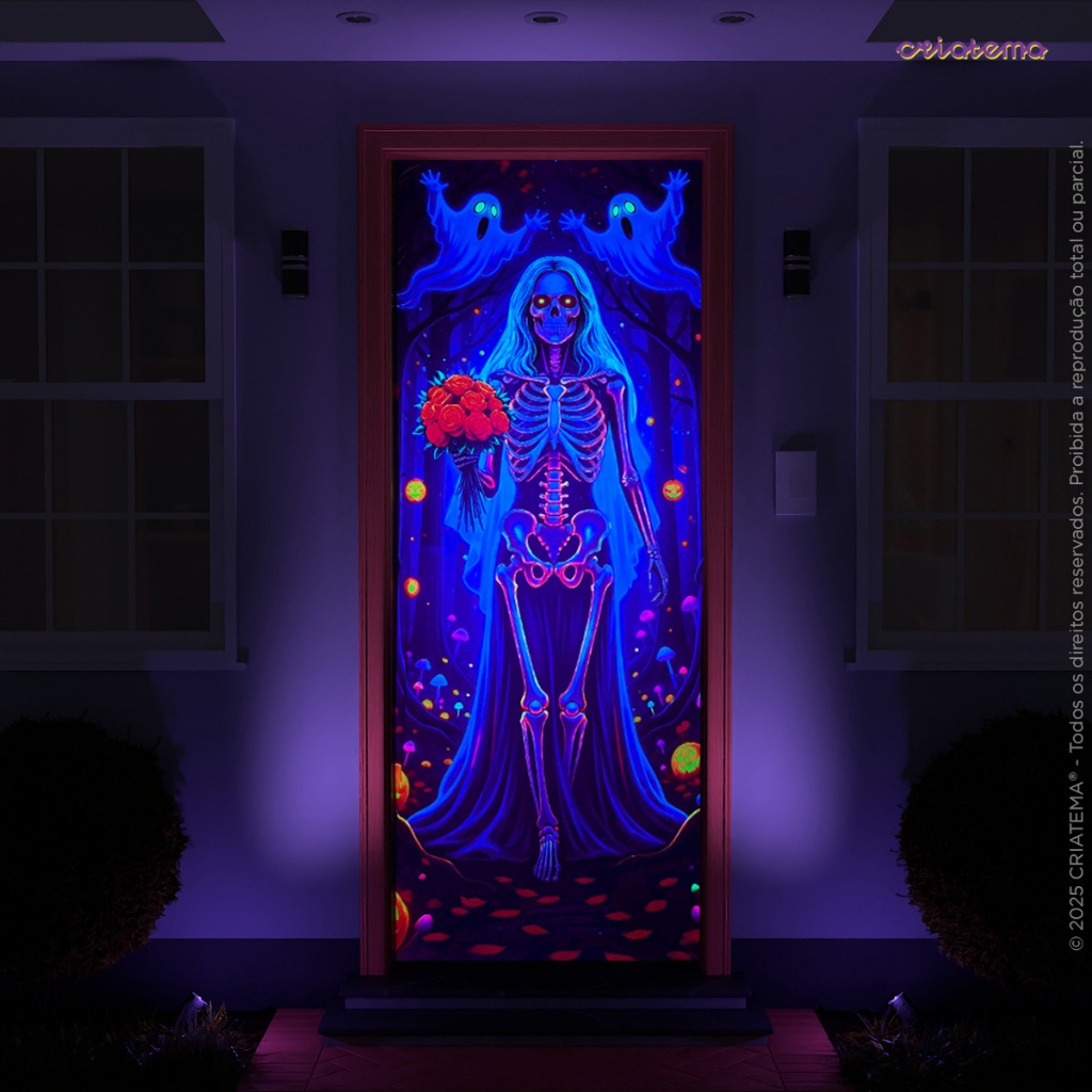 Capa Decoração de Porta Halloween Caveira Neon Brilha C/ Luz Negra 0,85x2,1m Tecido Sublimado C/Elástico