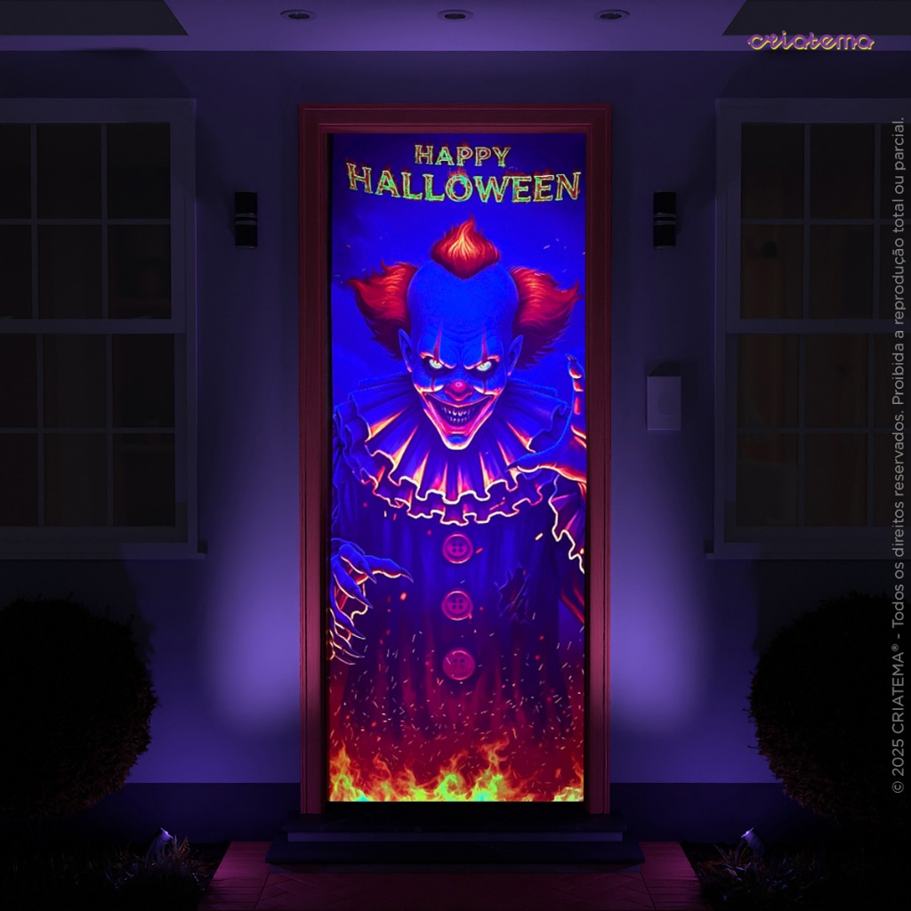 Capa Decoração de Porta Halloween Palhaço Neon Brilho C/ Luz Negra 0,85x2,1m Tecido Sublimado C/Elástico