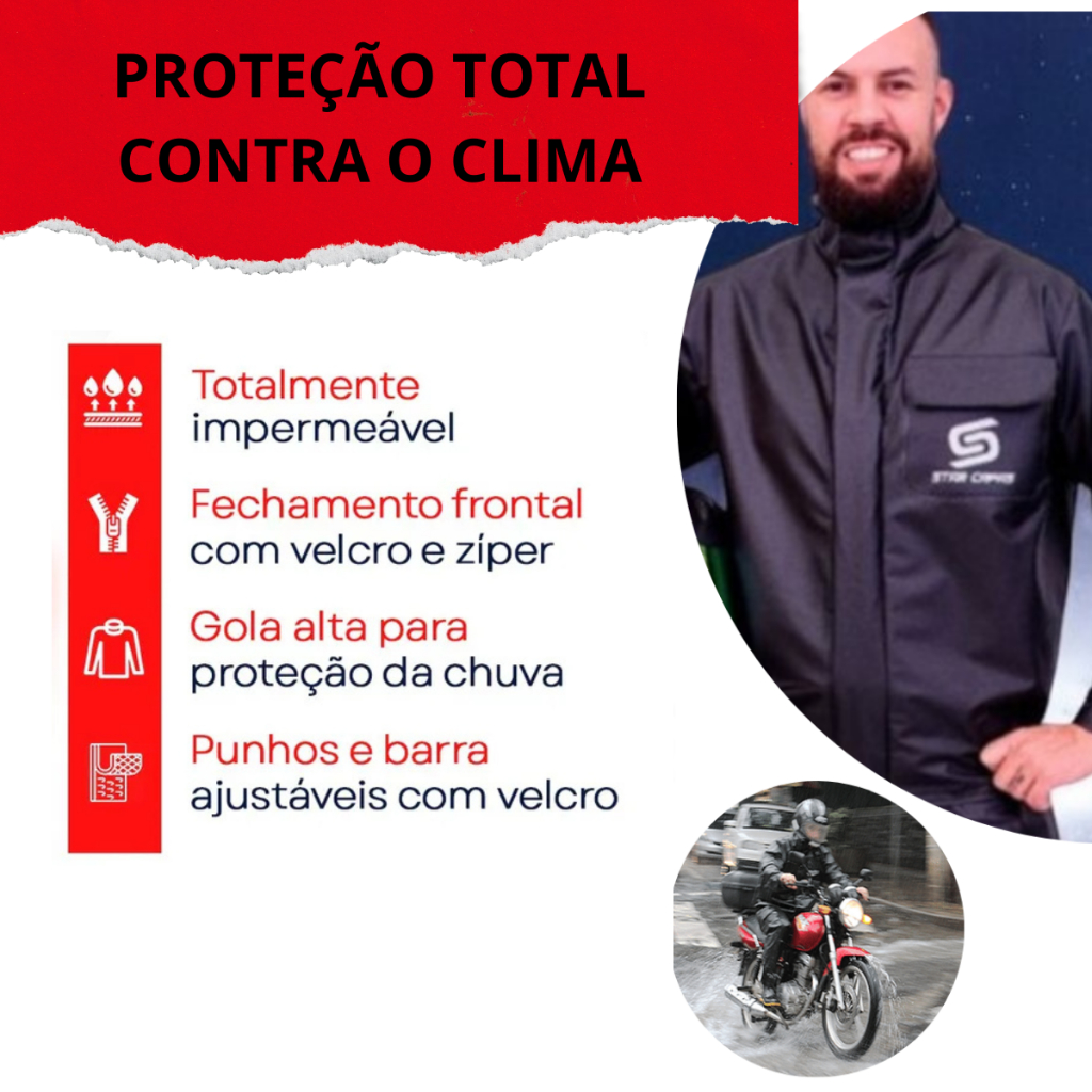 Conjunto de Chuva Motociclista PVC Luxo Star Capas O melhor custo-benefício do mercado, com diferencial único de 02 bolsos sendo um interno e um externo. O Conjunto de Chuva Star Capas é confeccionado em PVC 0,28mm, 100% impermeável, fácil transporte, resistente e duradouro. O Conjunto de Chuva Star Capas possui as características abaixo que certamente atenderão totalmente a sua necessidade de proteção contra chuva e ventos! Características: - 100% Impermeável - 02 Bolsos - Fechamento da capa com zíper e velcro e canaleta anti infiltração - Fechamento punho com velcro - Fechamento bainha com velcro - Gola alta - Calça com elástico - Refletivos na frente e costas - Couro Sintético PVC 0,28mm - Unissex - Material de fácil transporte e maleável Produto exatamente como nas fotos. Conteúdo da embalagem: - 01 calça - 01 jaqueta