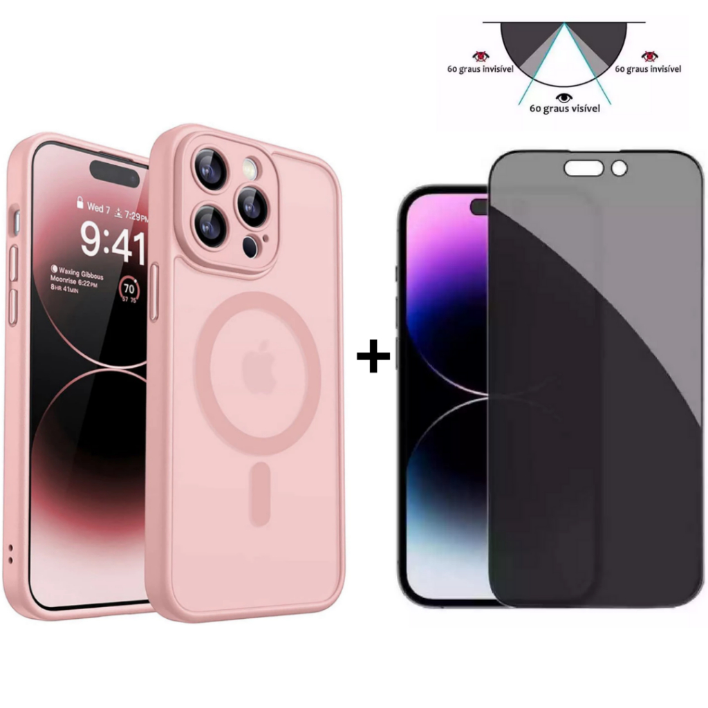 Capa Luxo Fosco + Pelicula Privacidade 3D Armadura Para iPhone 11 12 13 14 15 16 17 Pro Max