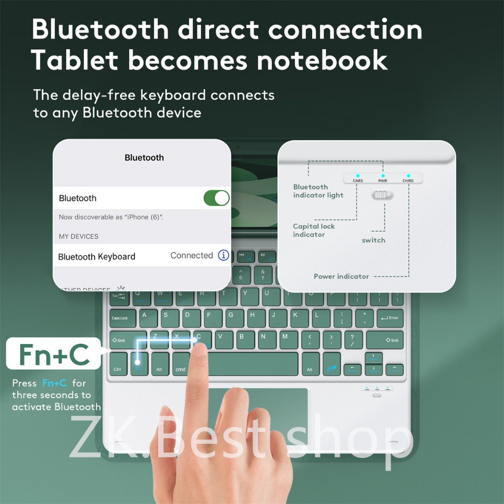 Case de trclado inteligente Capa magnético e trackpad teclado para ipad Air5 6 7 13 pro 10.5 12,9 7 8 9 11 M2 M3 M4 M5 E 10 geracao Suporte Caneta Conexao bluetooth ligue o bluetooth aperte as teclas juntas FN+c+c ( segurar a tecla FN e apertar a letra C 2 VEZES) em seguida conectar com o bluetooth keyboard. TEMOS UM VIDEO LOGO ACIMA PARA TE ENSINAR A CONECTAR. •100% Novinho •Este Estojo é confeccionado em material de alta qualidade •Auto Sono/função • Estojo de design inteligente, o tablet acorda quando a tampa é aberta, e o tablet dorme quando a tampa estiver fundida. Bateria dura várias semanas e carrega super rápido Essa é a melhor capa em custo benefício para seu iPad, feita com materiais de extrema qualidade e suporte para Apple pencil . • A capa traseira é projetada com estojo TPU macio, que protege o tablet melhor ao cair, e tem uma longa vida útil. • Capa traseira TPU + Couro PU é uma combinação perfeita, design leve, tampa traseira TPU melhor protege o tablet, couro PU destaca luxo, design estiloso e combinação combinando com vida de moda. • Fabricado em materiais de economia e ecologicamente ecologicamente, não possui odor, e não é fácil de tocar e fácil de limpar. • Design inteligente inteligente ergonômico, perspectiva multi-ângulo, você pode sentar e relógio, deitar e relógio. • O Case utiliza tecnologia de corte preciso, a posição do furo é preciso, a espessura da casca basta ultrapassar a câmera levantada, e o botão é melhor protegido sem atrapalhar o uso normal da função do botão. Para todos os problemas relacionados ao modelo, recomenda-se entrar em contato antes de comprar, e o atendimento ao cliente vai distinguir o modelo para você Caracteristicas do Produto teclado removivel magnetico[converte de para suporte] cobertura elegante em couro PU Orificios para camera frontal e traseira. Conteudo do pacote Estojo protetor de couro PU, Teclado ABS 3.0 sem fio removivel, com bateria de litio recarregavel, cabo de carregamento de energia USB e guia de usuario. Especificacoes Capacidade de bateria de polimero de litio embutida 200mah, tensao conector de carga de emergia de 3,7 V Entrada carga micro USB 5V tempo de espera 100 dias tempo de carregamento 3-4 horas tempo de trabalho ininterrupto 100 horas temperatura operacional 20C 55C temperatura de armazenamento 40C- 70C Distancia de trabalho 10 metros sistema de modulacao GFSK Nome do produto teclado BLUETOOTH N-M HD- 3030 Potencia nominal 0,5 W Frequencia nominal 50-60 Hz Tensao nominal 3,0-4,2 V Lista de embalagem 1 - Capa teclado com touchpad 1 - Livro de instruções 1 - Cabo USB