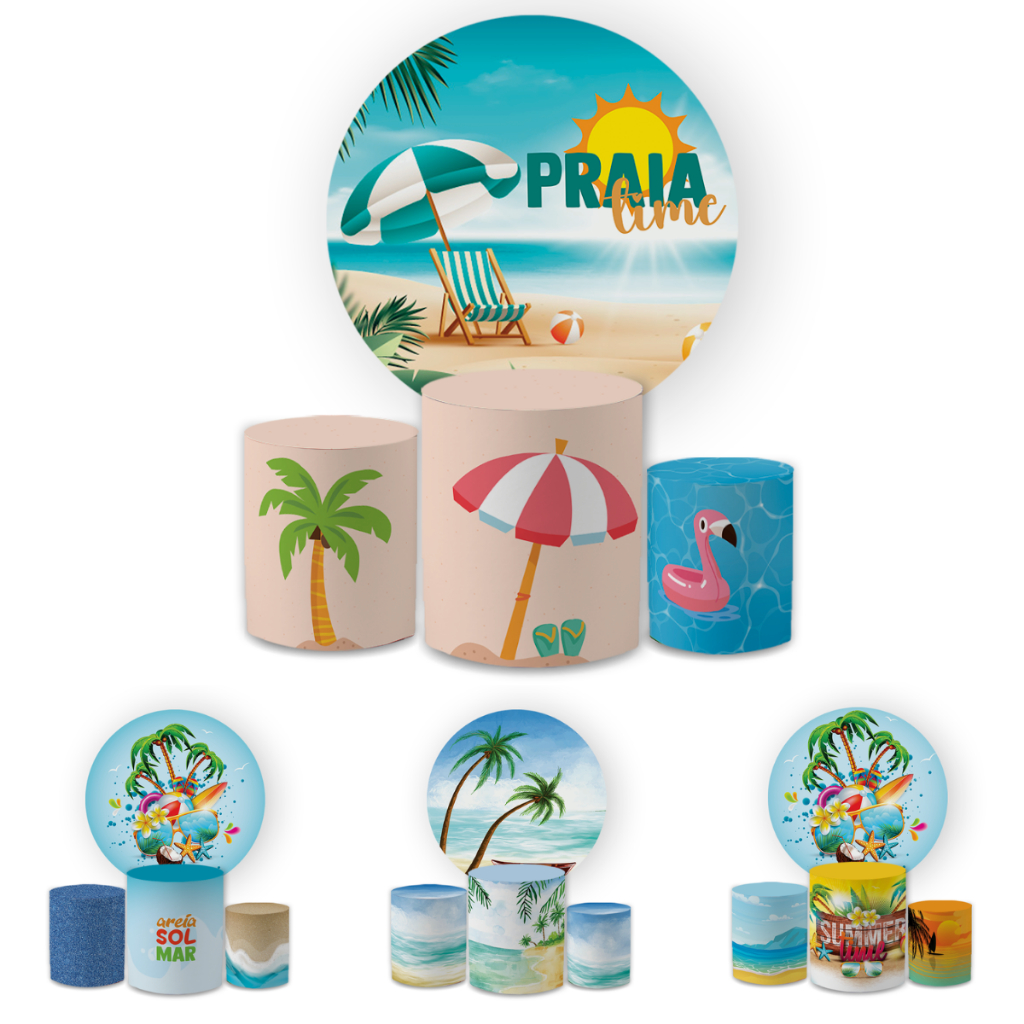 Capa Painei de Festa Veste Fácil Redondo+ Cilindro Sublimado Malha New Tema Praia Curtindo Verão Decorativo Bibi Paineis