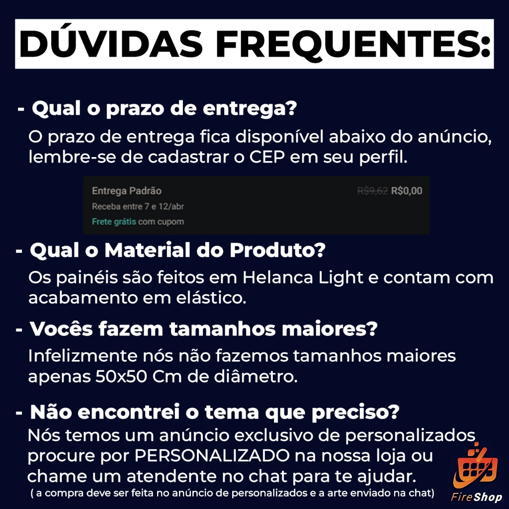 Fire Shop — O Cenário Perfeito para sua Festa! As imagens acima vão sem a marca d'agua e na qualidade ULTRA HD Descrição do produto CAPA PAINEL 50X50 NECESSITA DO SUPORTE EM MDF OU ARCO METALICO (não incluso) Caso não tenha encontrado o modelo desejado Procure por PERSONALIZADO em nossa loja, temos um anúncio em que fazemos a arte que desejar, ou chame um atendente no chat para auxilia-lo (a) ATENÇÃO TODAS AS COMPRAS SÃO ENVIADAS EM ATÉ 24 HORAS ÚTEIS ALGUMAS COMPRAS PODEM SER DESPACHADAS NO MESMO DIA PAINEL REDONDO 50X50 ESSA E A MEDIDA REAL NAO CONFUNDAM LEIAM A DESCRIÇAO DESDE JA AGRADEÇO; ESPECIFICAÇÕES DO PRODUTO Os Painéis Redondos são produzidos com qualidade fotográfica em impressão sublimática digital de última tecnologia Estamos sempre atentos às novidades e tendência do mercado O material é Tecido Helanca Light de ótimo caimento e não reflete luz O melhor disso tudo NÃO AMASSA Isso é o sonho de todo decorador Possui costura overlock nas laterais para não desfiar e elástico Apenas para Painéis Redondos e Capas de Cilindro para melhor ajuste Pode ser molhado ou lavado com água e sabão neutro evite ser exposto ao sol pois secam rapidamente As cores dos produtos podem variar de tonalidade em 15 devido resolução do monitor ou tela do celular mas nada que interfira na qualidade e beleza do mesmo SOBRE EFEITOS 3D 4K 8K E GLITTER São efeitos que NÃO podem serem visto à olho nu somente por trás de lentes de câmeras Exemplo quando vamos no cinema e tiramos o óculos fica turvo e aparentemente tremidas as imagens e assim são o mesmo com as imagens impressas Façam o teste se não conhecerem dos efeitos e visualize o quanto ficam lindas e maravilhosas e encante seu público alvo PAINEL REDONDO Não acompanha estrutura A medida é de 50 x50 ATENÇÃO CLIENTES Não fazemos alterações ou troca das imagens do anúncio Não aceitamos artes prontas inclusão de nomes idades (a não ser que a compra seja feita no anuncio de PERSONALIZADOS) Compras com boleto levam de 2 à 3 dias úteis para liberação Caso tenha divergência com seu produto nos acione através dos canais de comunicação antes de efetuar devoluções e cancelamentos nos chame nas mensagens para buscarmos uma solução em conjunto -Pode ser molhado ou Lavado com agua e sabão neutro ,evitar de ser colocado no sol -Veste Fácil C/ Elástico Nas Bordas - Todos os nossos produtos possuem garantia Envie uma mensagem para gente caso tenha algum problema com seu pedido, vamos fazer o possível para garantir sua satisfação. OBSERVACOES IMPORTANTES Atente-se aos prazos de produção e entrega informados no anuncio.