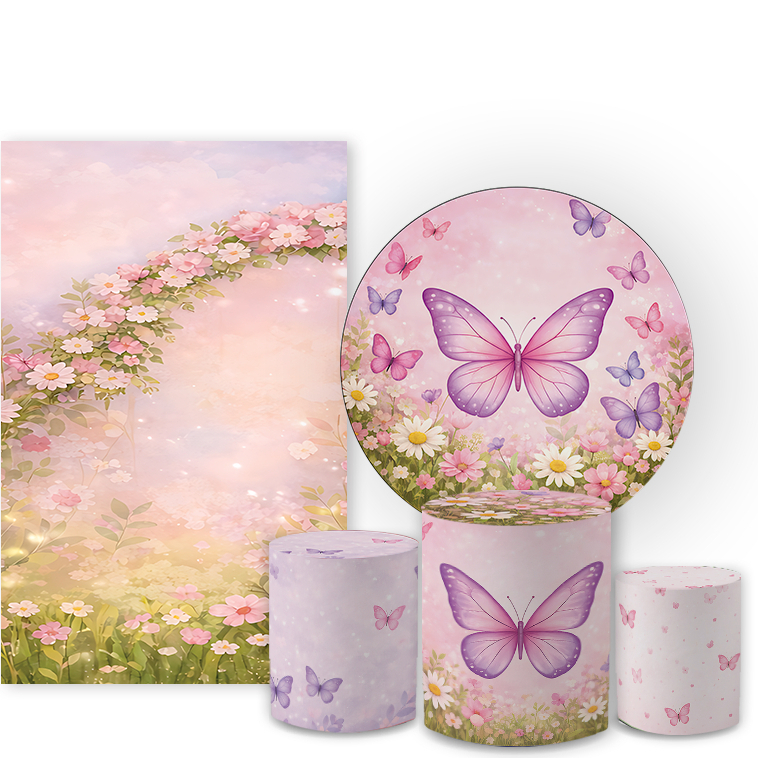 Capa Painel Redondo 1.50m + Trio Cilindro Decoração Infantil Jardim Encantada Borboletas Novidade Bibi