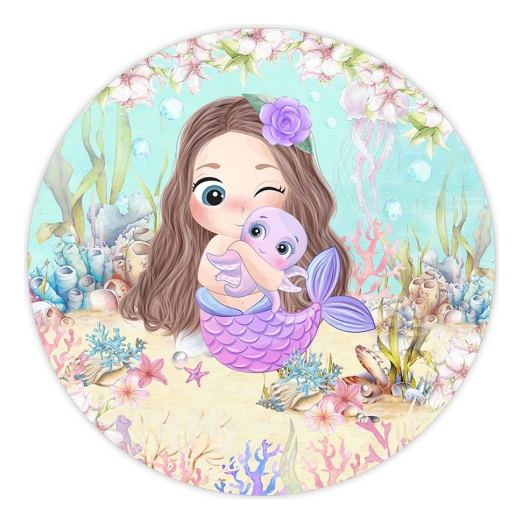 Capa Painel Redondo 150x150 Festa Sereia Cute 50x50 Aniversario Mar