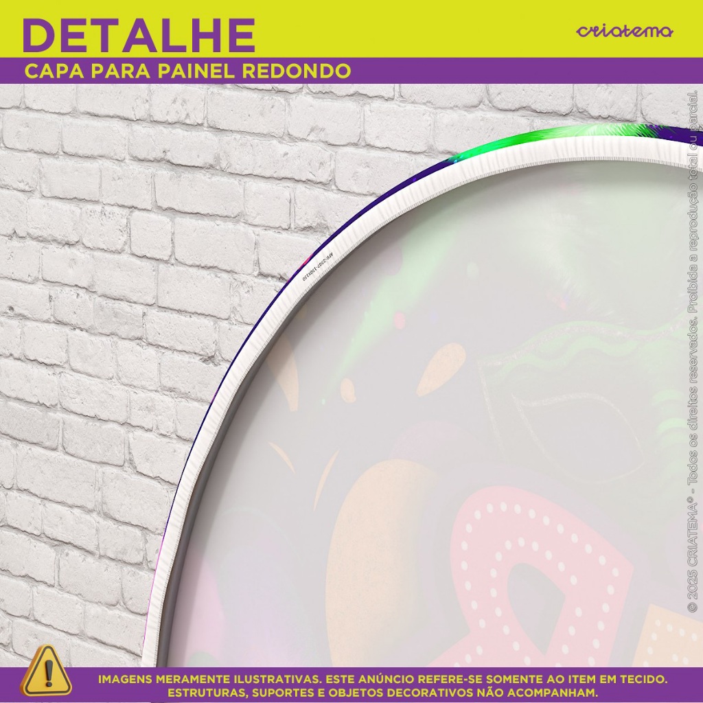 >>> PAINEL REDONDO EM TECIDO COM ACABAMENTO EM ELÁSTICO <<< UTILIZAÇÃO EM ESTRUTURAS CIRCULARES ENTRE 1,20 ATÉ 1,50 DE DIÂMETRO. >>> PAINEL NÃO POSSUI EMENDA!!! Com impressão de alta qualidade, cores vivas, imagens nítidas e acabamento perfeito, o painel redondo da Criatema é o detalhe perfeito para ter resultado incrível em sua decoração, com ótimo custo x benefício. DETALHES DO PAINEL EM TECIDO: >>> Tecido Malha New (Que estica e não amassa). >>> Tecido Leve com ótimo caimento >>> Gramatura: 140g/m de excelente qualidade. >>> Composição do Tecido: 95% Poliéster e 5% de Elastano. >>> Elástico costurado ao redor do painel. >>> Acabamento em overloque evitando que o painel desfie. PORQUE ESCOLHER O PAINEL SUBLIMADO DA CRIATEMA: >>> Melhor opção para quem procura ótimo custo x benefício >>> Não amassa (por ser feito em tecido especial. Bem melhor do que os de lona) >>> Não desbota, por ser sublimado em tecido >>> Pode ser lavado quantas vezes desejar >>> Seca rapidamente depois de molhado >>> Pode ser passado (recomendamos não usar alta temperatura) >>> Instale na estrutura circular em alguns minutos >>> Sua decoração muito mais cheia de vida >>> Alta durabilidade >>> Não reflete luz na hora das suas fotos PRAZO DE PRODUÇÃO E ENVIO: - TODOS OS PEDIDOS ACOMPANHAM NOTA FISCAL. - Os nossos painéis são produzidos e postados em até 1 DIA ÚTIL após pagamento aprovado. - Nosso painel possui garantia contra defeito de fabricação.